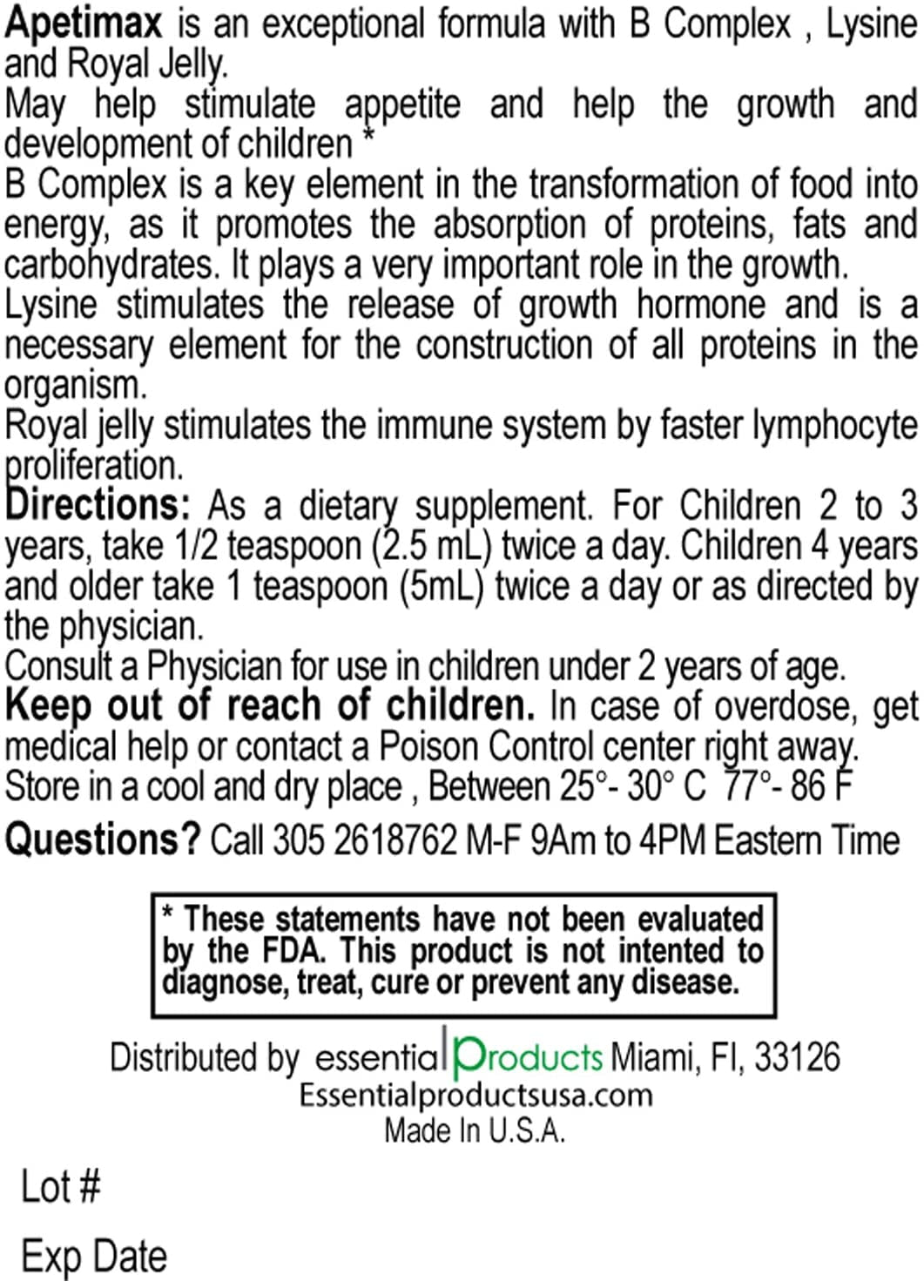 ELP ESSENTIAL Apetimax Vitamins Lysine Royal Jelly Promotes Appetite Syrup for Adults and Kids (4Oz for Kids)