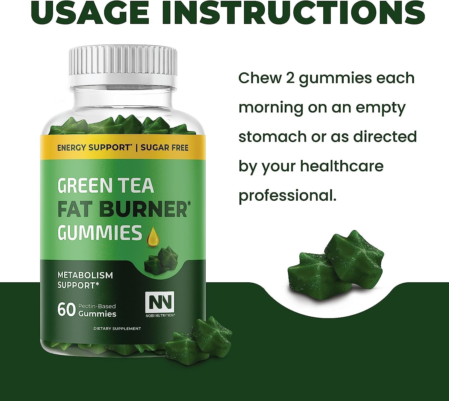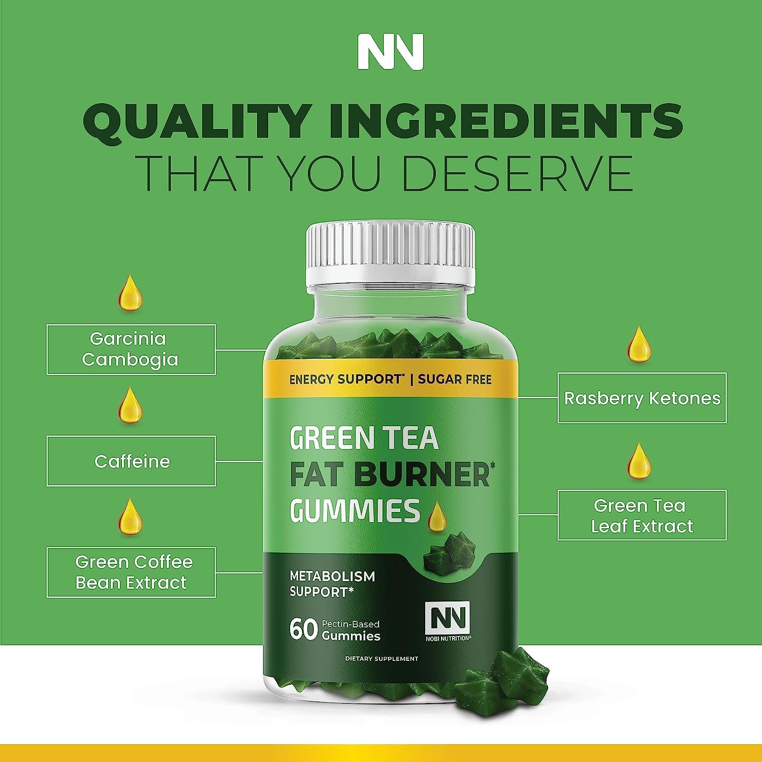 - 30-DAY SUPPLY: Each bottle of Green Tea Fat Burner Gummies by Nobi Nutrition contains 60 apple-flavored gummies (a 30-day supply). These gummies are pectin-based and contain no artificial flavors or colors. They are third-party tested and manufactured in the USA in a facility that adheres to GMP guidelines.