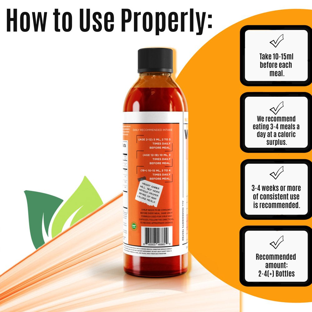 Nutrigain Weight Gain Syrup: Designed for Quick, and Efficient Weight Gain, Supports a Healthier Appetite, Mass, and Boost in Metabolism to Digest Food more Efficiently. Nutrigain both supplements nutrients not found in most diets and supports an easier weight gain transition. Our Exclusive Nutrigain Formula is packed with all-natural vitamins and ingredients that work harmoniously to help provide amazing results. Nutrigain supports more balanced hormones, while also helping with digestion and can even lower bloating issues. Nutrigain key ingredients feature vitamins such as Thiamine, Niacin, Vitamin B-6, Pantothenic acid, Lysine, Creatine, Fenugreek, Blessed thistle, L-theanine, and Maca root in herbal form. You can trust that Nutrigain Weight Gain Syrup was formulated to deliver the best possible results by understanding that our ingredients help with powerful components in your body such as supporting aerobic metabolism, cell growth, energy conversion, immune system health, and hormonal balance to maximize weight gain support. Our product has been clinically tested and built by science. Embark on your weight gain journey with confidence knowing that Nutrigain is here to support you every step of the way. We believe weight gain is a lifestyle, choices, and habits. Remember to enjoy the journey. We recommend trying 2 to 4 bottles of Nutrigain Weight Gain Syrup and increasing your caloric intake to maximize its efficiency. Our goal is to help and support you to achieve any weight gain goal you want. Key Benefits: Supports quicker and more efficient weight gain Promotes a healthier appetite Enhances muscle growth Supports digestion and can help reduce bloating Provides metabolic energy Contains all-natural and organic vitamins Balances hormones for optimal results Can help boosts immune system health Herbs included are essential for fatty acid metabolism Can support an increase in energy supplied to blood cells Directions: Take 10-15ml for breakfast, 10-15ml for lunch and 10-15ml at night. (Check back of bottle for Age and Size Requirements) Eat 3-4 meals and drink over 8 glasses of water a day for best results. Recommended Amount: 2-4(+) bottles Average timeframe of improvement seen in as soon as 3-4 weeks of consistent use. (Results may vary) Enjoy your weight gain journey!