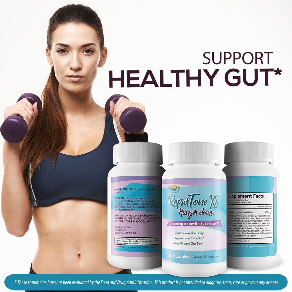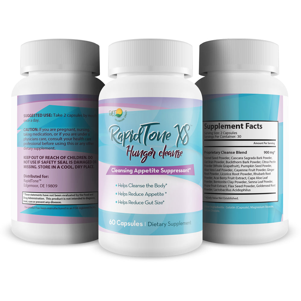 Cleansing the body and digestive tract is one of the most important steps of a proper and effective diet. The body is not able to absorb nutrition and diet products properly if the digestive system is not working well. RapidTone XS Hunger Cleanse is the Ultimate Flush Colon Cleanse and Detox pill available! Use this product for a Turbo Colon Cleanse! Support Keto dieting with a Pure Colon Detox strategy. Ketosis requires the body to switch from burning carbohydrates to burning fats. Clearing unwanted carbohydrates out of the digestive tract speeds up the bodies transition to ketosis and paves the way for healthy fats to be absorbed! This product is meant to be paired in a 3 part RapidTone Diet system 1 Rapid Tone XS Thermo Burn 2 Rapid Tone XS Hunger Cleanse 3 Rapid Tone XS Luna Trim Sleep
