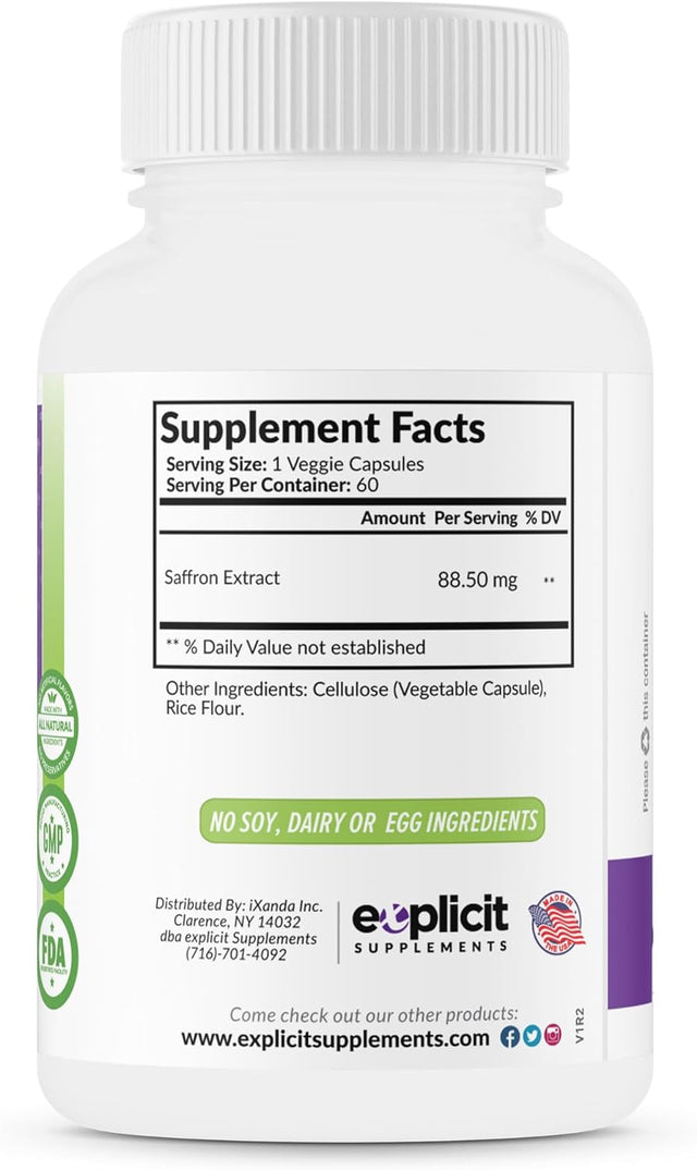 • Just 1-2 easy to swallow capsules a day is all it takes. No junk, just simple & safe ingredients. You want pure saffron, not a bunch of garbage. Our capsules contain only Saffron and rice flour (to fill them). This means no junk and no dairy, eggs or gluten. Even our capsules are made from plants!