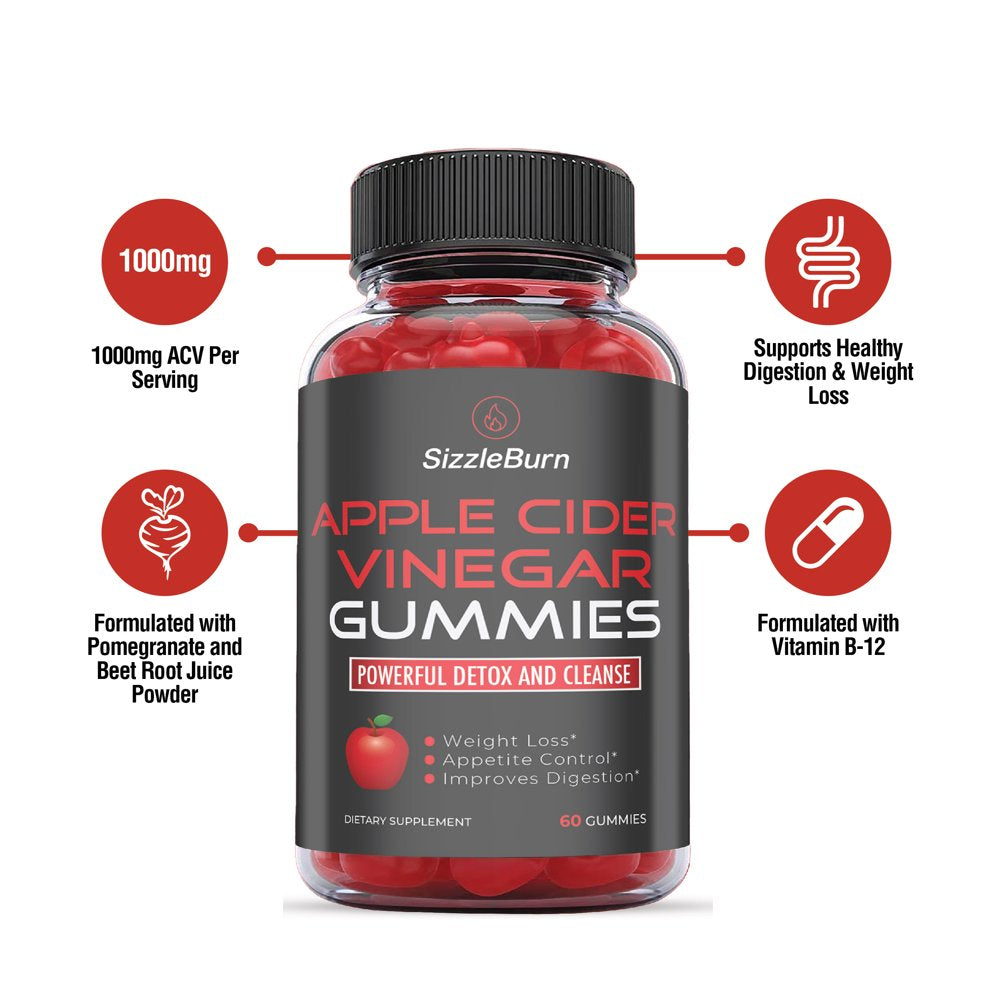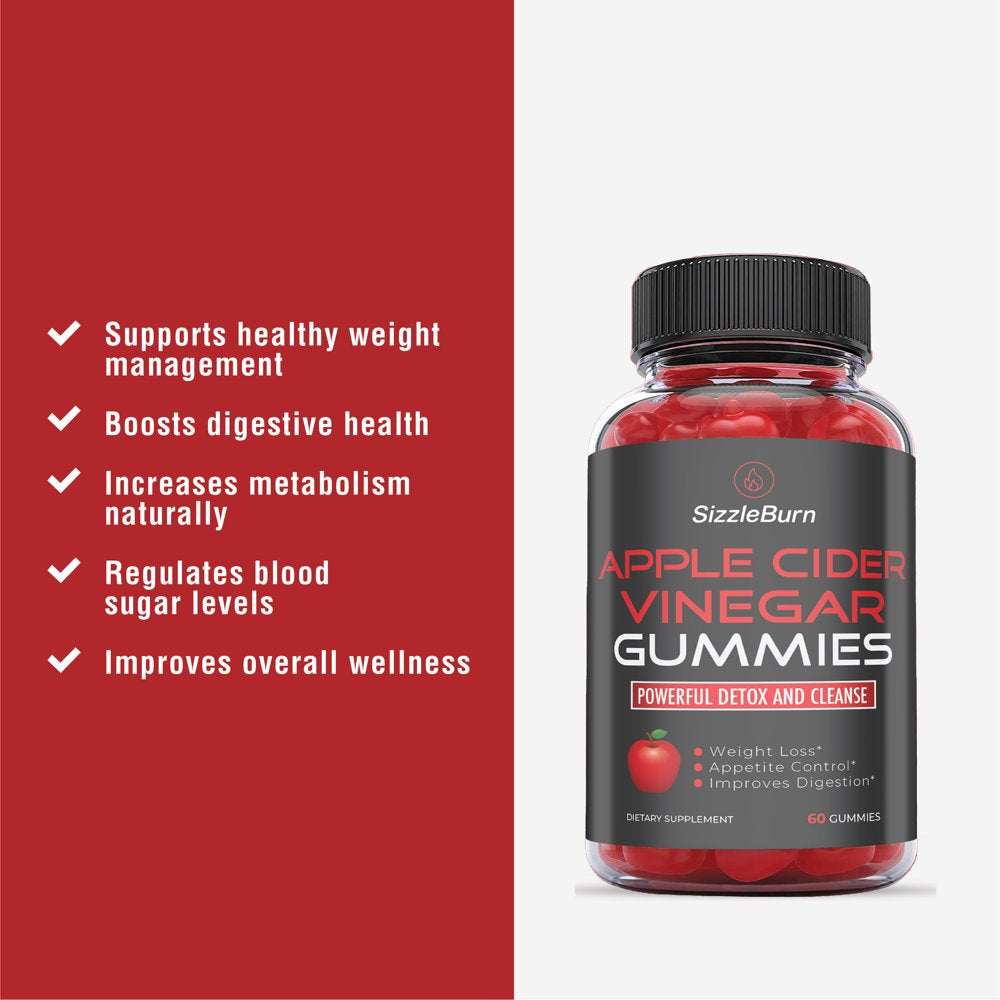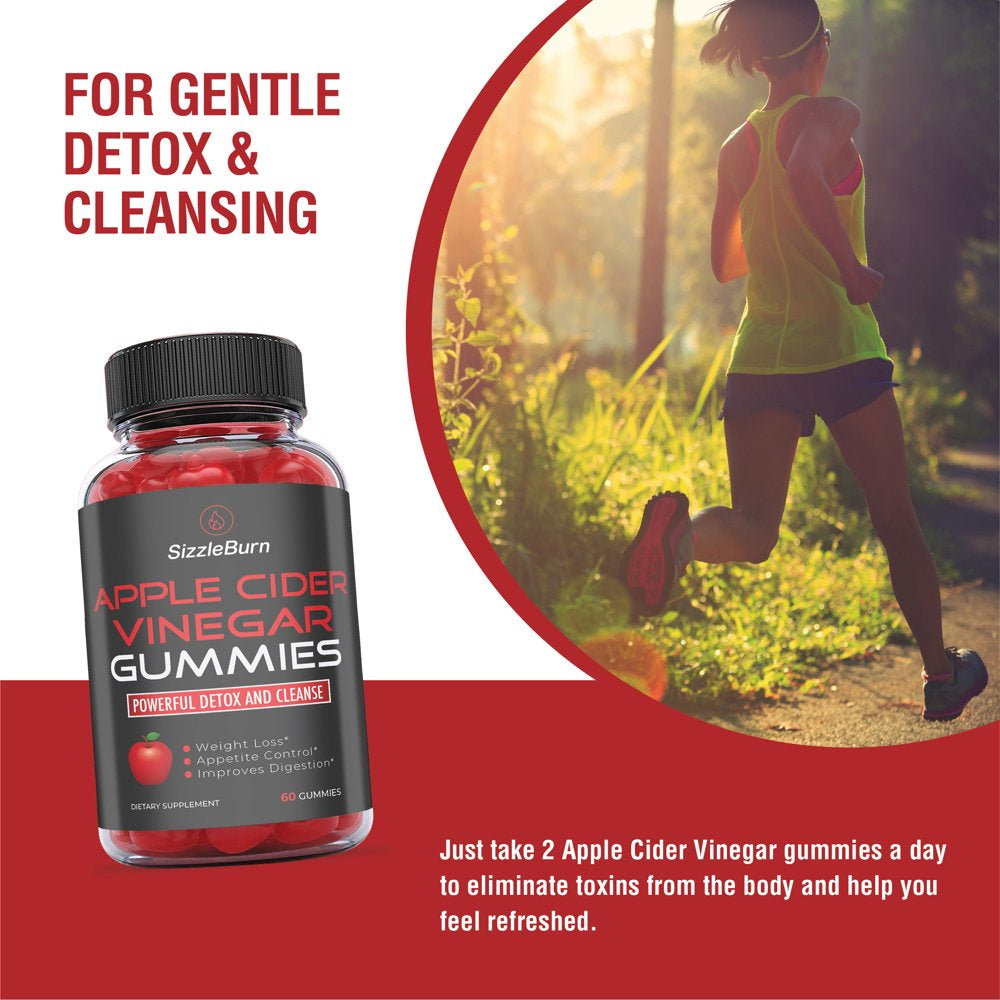 SizzleBurn Apple Cider Vinegar Gummies naturally eliminates toxins from the body to help you feel refreshed and energized & improve digestive health naturally. These ACV gummies are perfect for detoxing, cleansing & bloating relief.