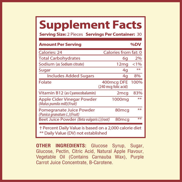 Carbohydrates, Sodium, Sugars, Folate, Vitamin B12, Apple Cider Vinegar Powder, Pomegranate Juice Powder, Beet Juice Powder/div>