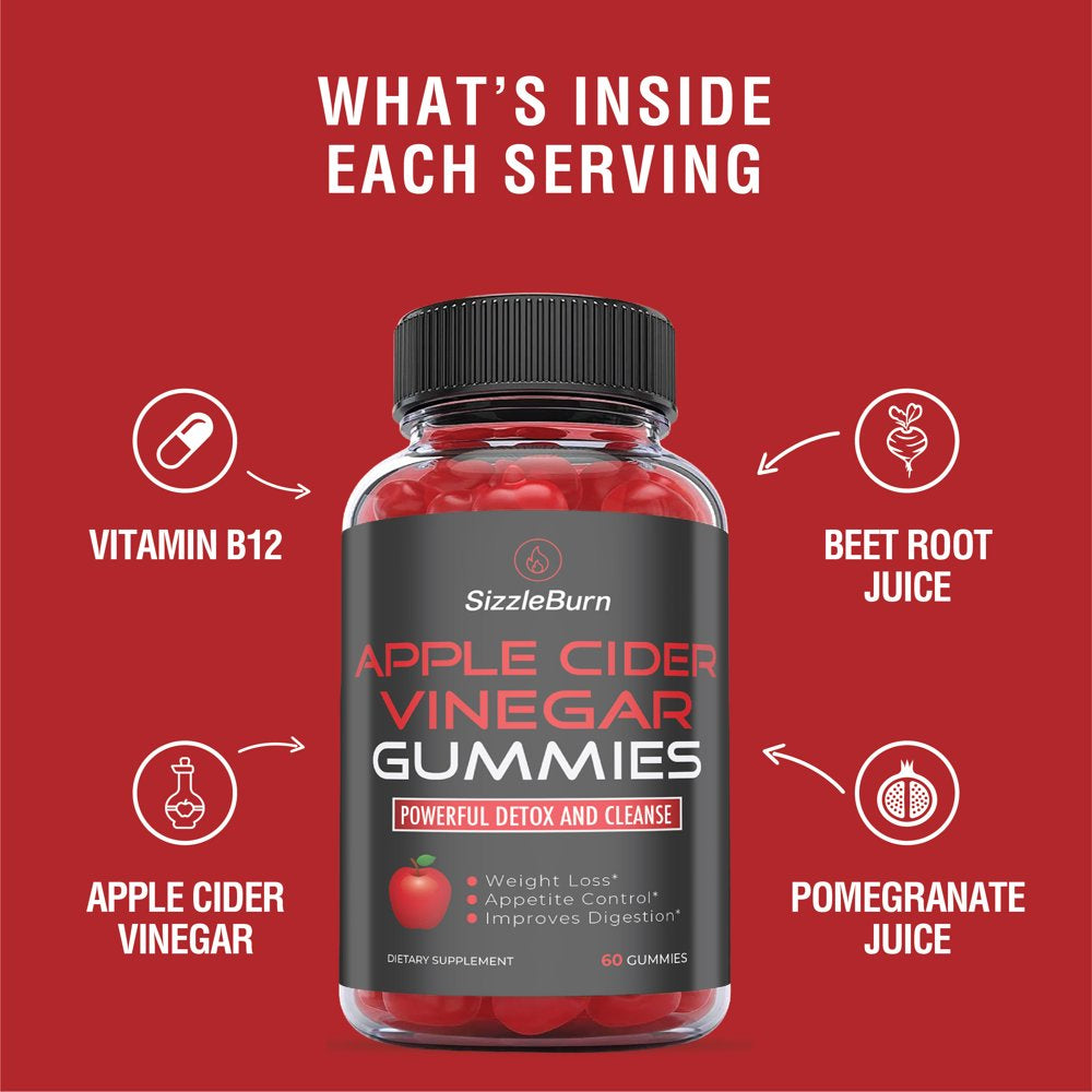 • PACKED WITH VITAMINS: Made with the world's fines apples, beetroot and pomegranate, SizzleBurn Apple Cider Vinegar Gummies are as delicious as they are good for you. Our vegan friendly formula is packed with Vitamin B12 that will help improve your mood, metabolism and much more.