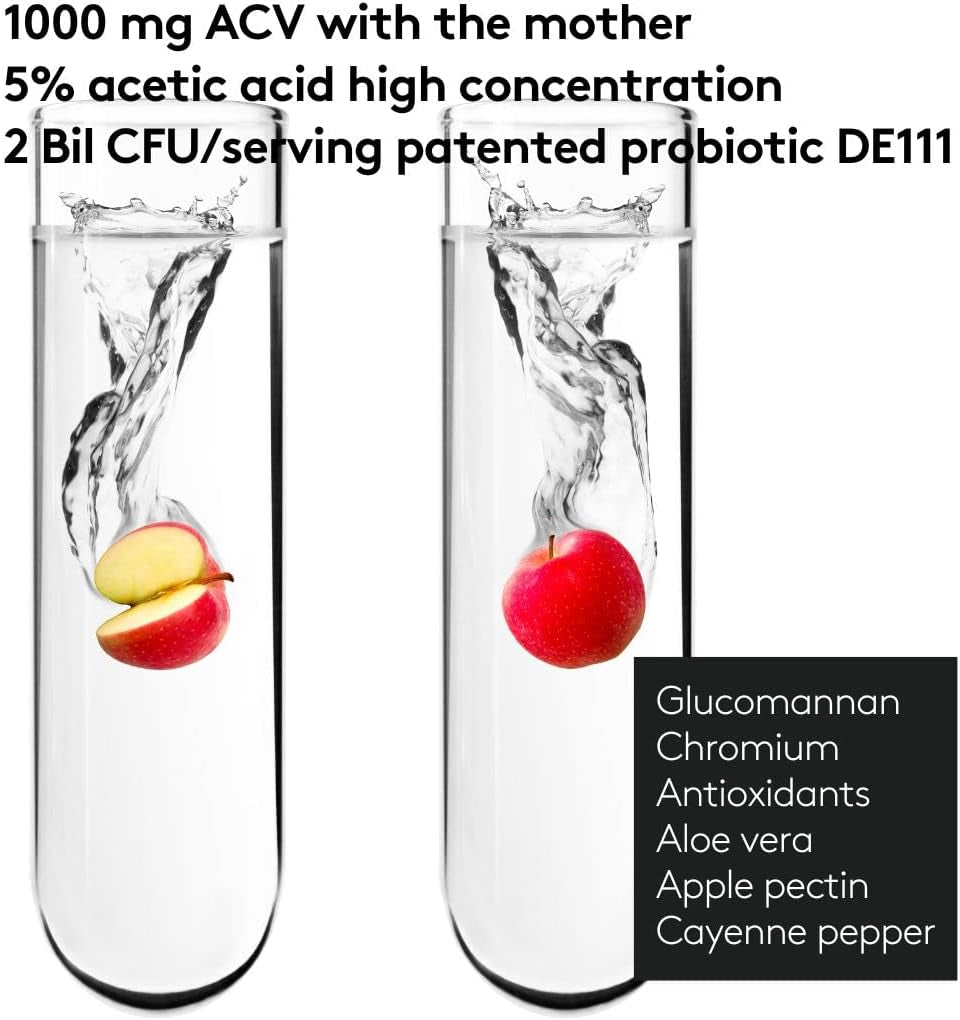 • [ What’s in it ]: 1000 mg ACV with the mother - 5% acetic acid high concentration | 2 Bil CFU/serving patented probiotic DE111 | Glucomannan | Chromium | Powerful antioxidants aloe vera & apple pectin and cayenne pepper