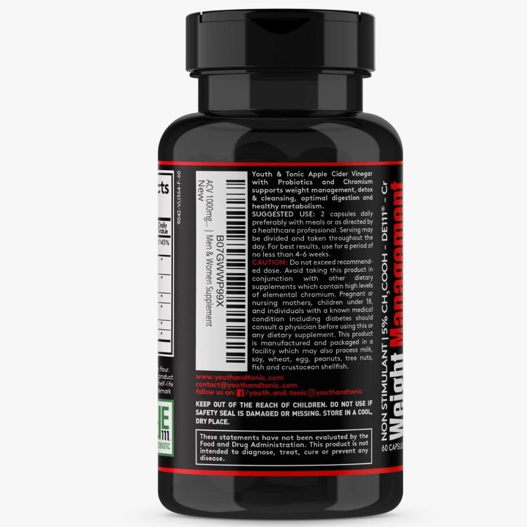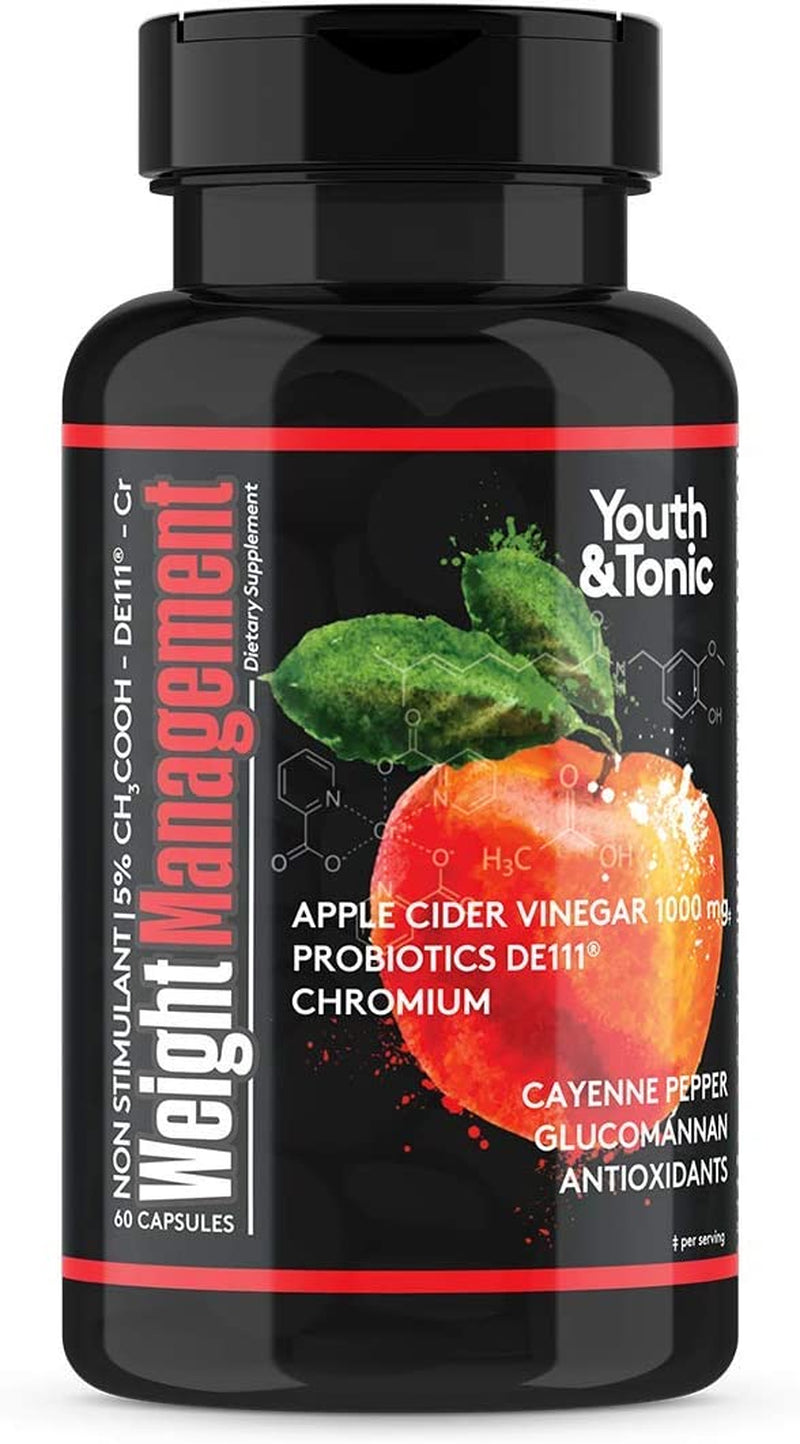 Youth & Tonic Natural Appetite Suppressant for Weight Loss / 1000 Mg Apple Cider Vinegar Pills with Glucomannan Chromium DE111 Probiotic for Women & Men / 60 Veggie Capsules