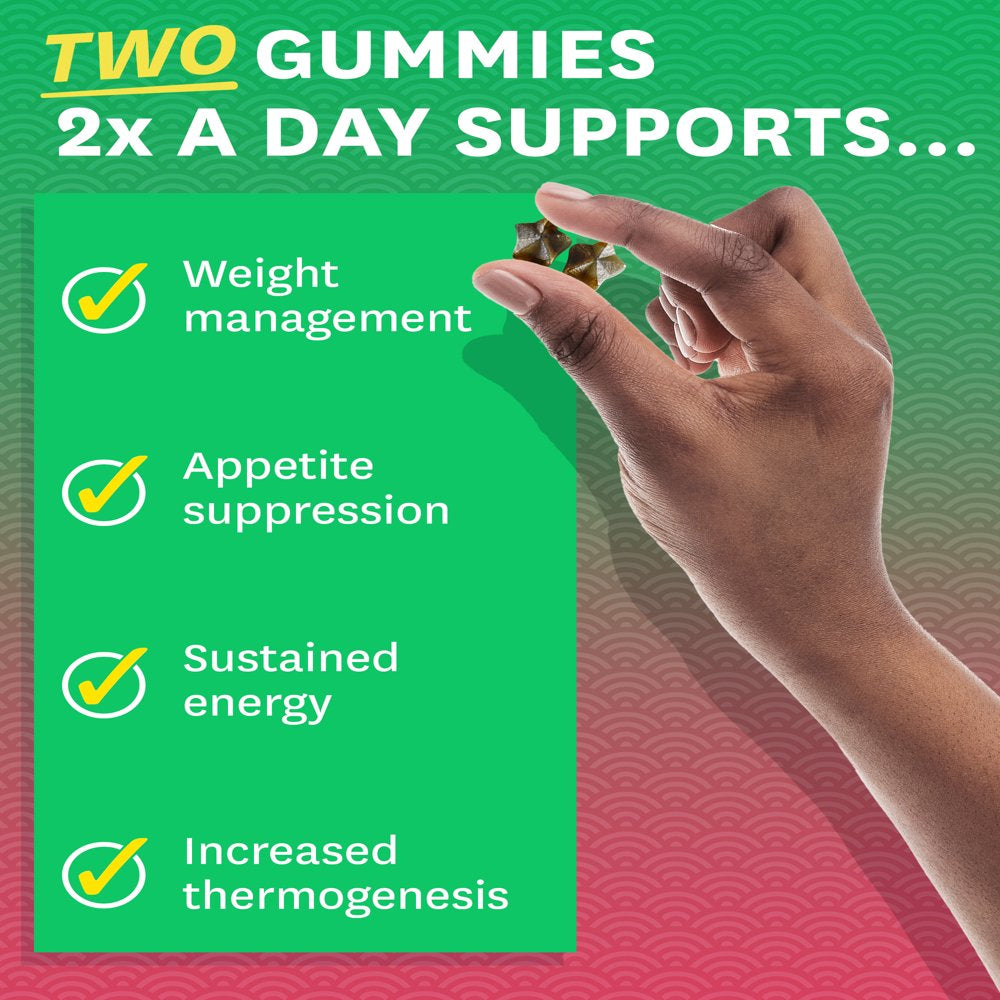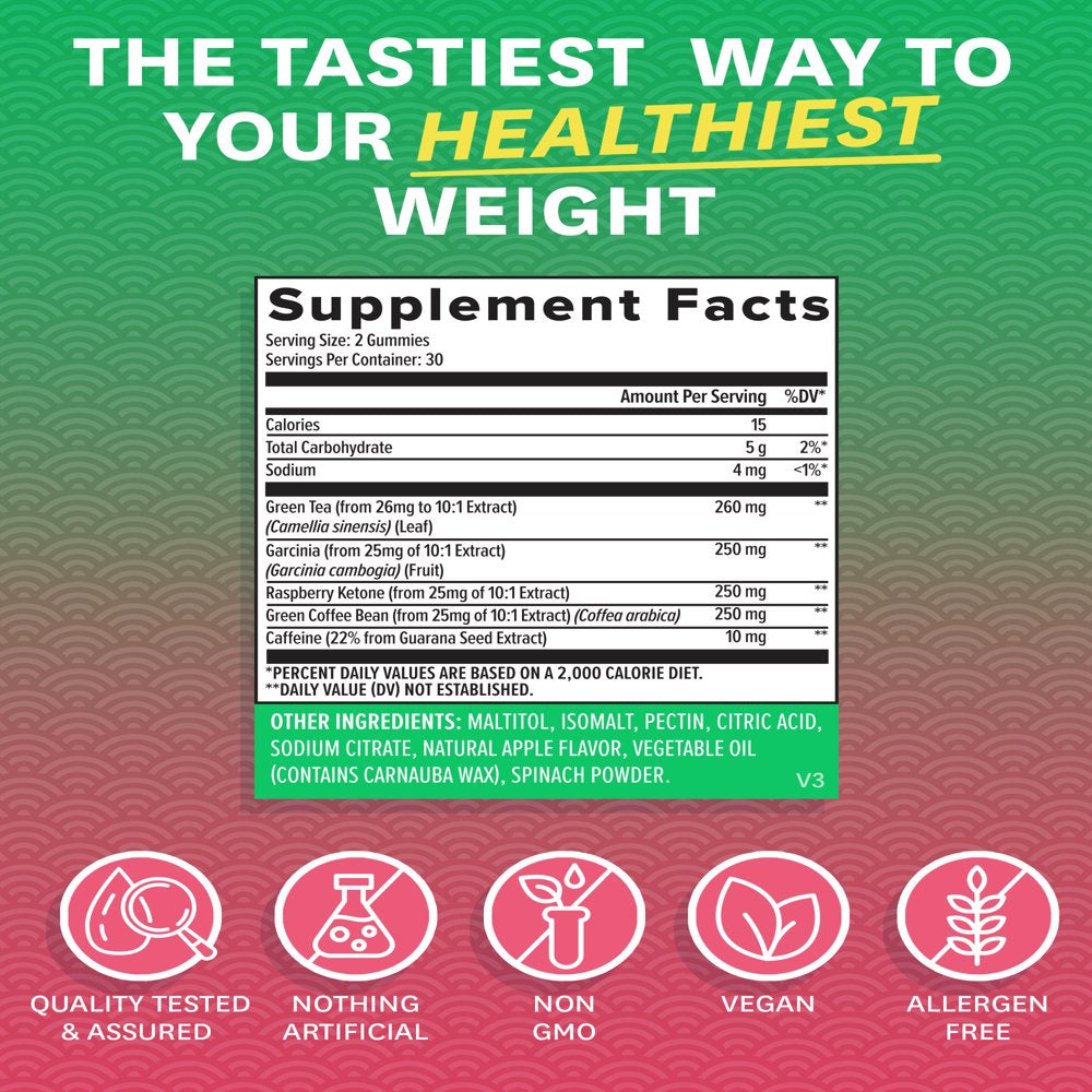 - Natural Apple Flavor Gummy Energy: With 260mg of Green Tea Extract, 250mg Garcinia, 250mg Raspberry Ketone + 250mg Green Coffee Bean. Premium non-GMO formula for non-jittery energy.