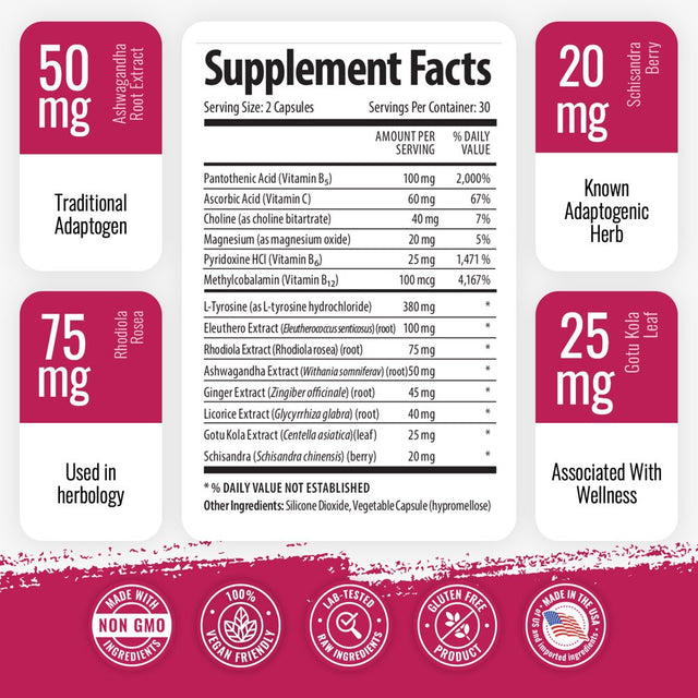 1 Body's Adaptogen Complex is a unique blend designed to supplement the dietary needs of your adrenal glands. An insufficiency in adrenaline is the end response of stress & fatigue. Proper nutrition, rest, and time are required to repair your adrenals. Our research could not find sufficient evidence that raw desiccated bovine cortex could sufficiently enhance the repair process of the adrenal glands, therefore it was not included in the formula. Adaptogen Support - Cortisol Manager - A complex formula containing Rhodiola Rosea, Vitamin B12, B5, B6, Magnesium, Ginger Root Extract, Ashwagandha, Schizandra Berry, Licorice & more - Vegetarian. It helps support adrenal gland health & reduce fatigue. Promotes healthy cortisol levels. Promotes a sense of calm. May assist in stress reduction & adaptability. Free ebook 'Adrenal Fatigue Reset Diet' emailed to customer after product ships.