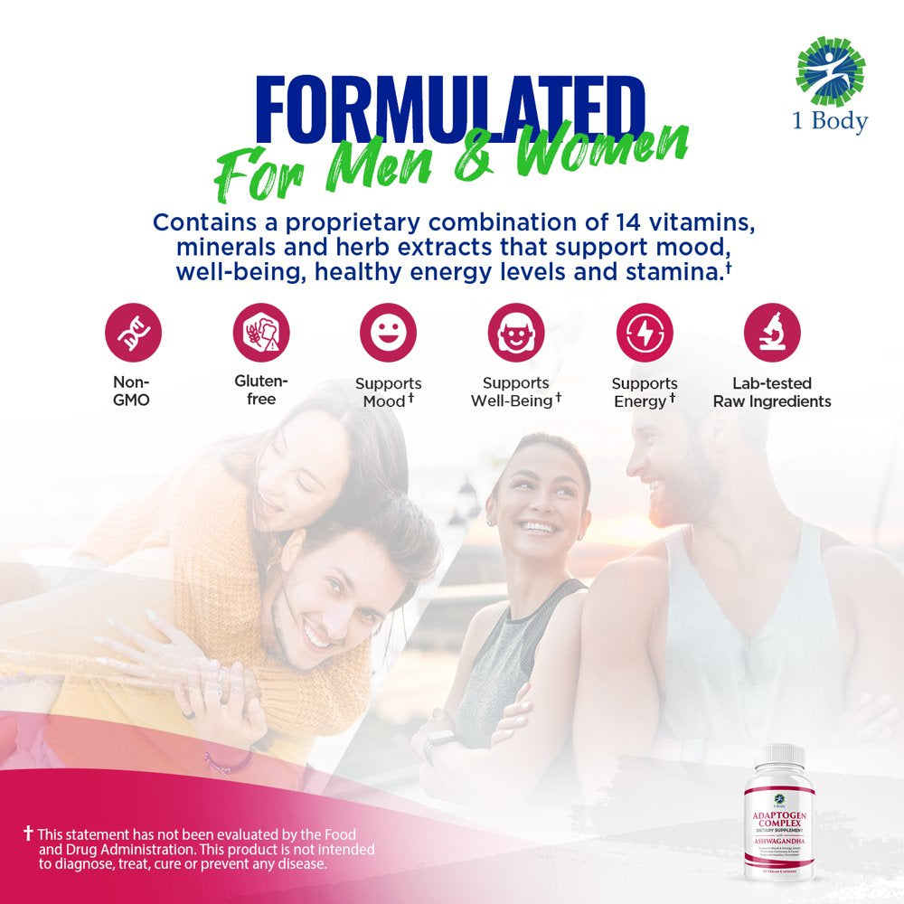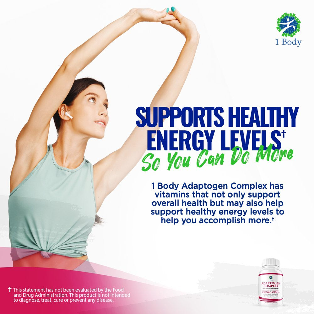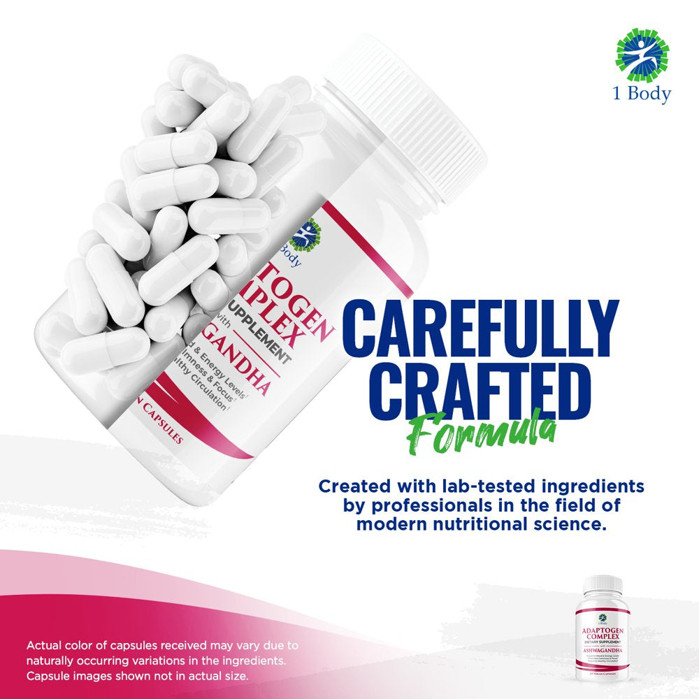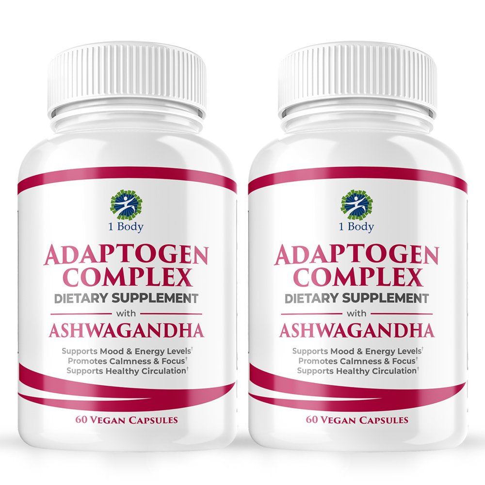 (2 Bottles) 1 Body Adaptogen Complex Cortisol Manager Vegan Capsules - Rhodiola Rosea, Magnesium, Ginger Root Extract, Ashwagandha, Schizandra Berry, Licorice & More