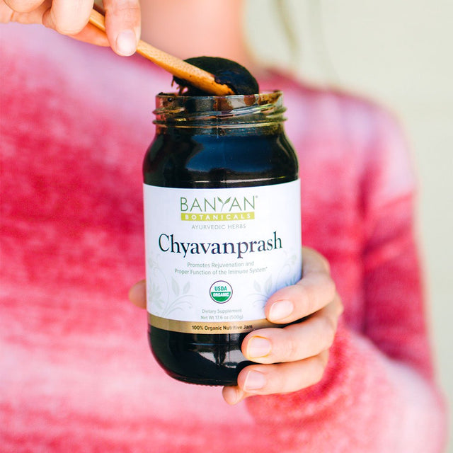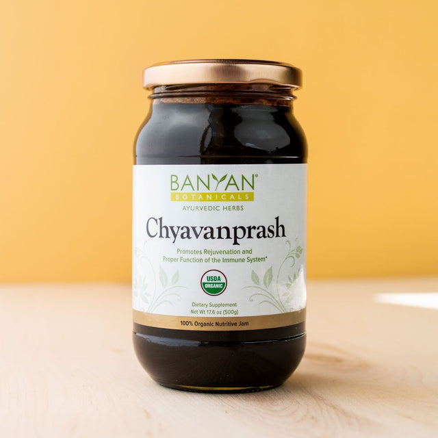 Our Chyavanprash is based on a traditional Ayurvedic herbal jam recipe made in a base of amalaki fruit, a natural source of antioxidants. This excellent rejuvenative nourishes and strengthens the body, providing energy and vitality. Chyavanprash is an excellent method for daily herbal consumption due to its unique constituents of cane sugar, ghee, and honey. Proven effective over a thousand years of use, these nourishing tastes play the important role of "carriers" that allow the herbs to penetrate deep into the tissues. In a small daily dose (1 or 2 teaspoons), this healthy jam makes for a tasty and very healthful treat. This tridoshic formula stimulates metabolism and enkindles the digestive fire without aggravating pitta. It balances vata and kapha while strengthening the body against the effects of a stressful lifestyle. The energizing herbs bolster the immune system and help maintain health and well-being throughout the year.*