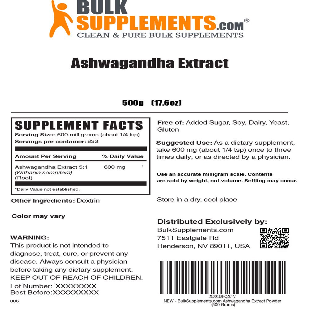 Product Name BulkSupplements.com Ashwagandha Extract Powder, 600mg - Brain & Energy Support (500g - 833 Servings)