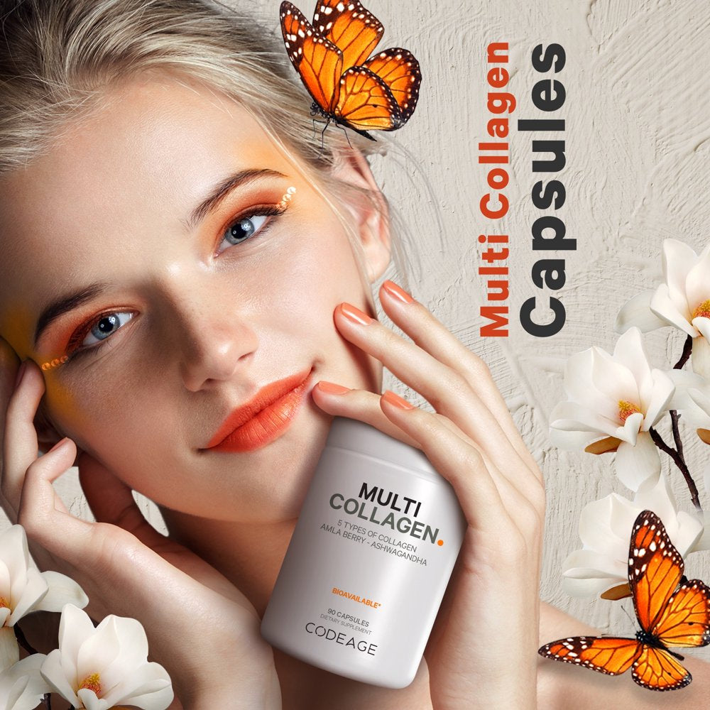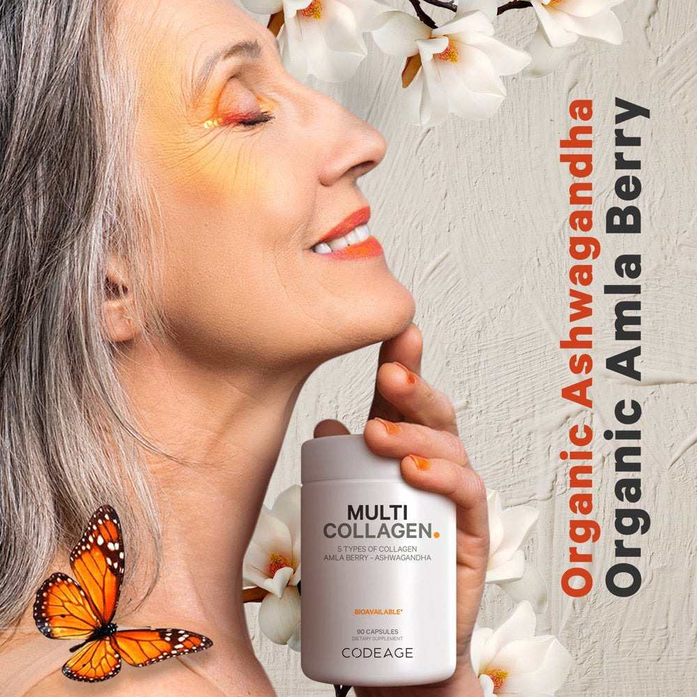 Codeage Multi-Collagen protein capsules is a premium multi-type collagen supplement featuring 5 Types of Collagen I, II, III, V, X with Organic Ashwagandha and Amla Berries extracts. This formula also provides 18 different amino acids in an easy to use format.