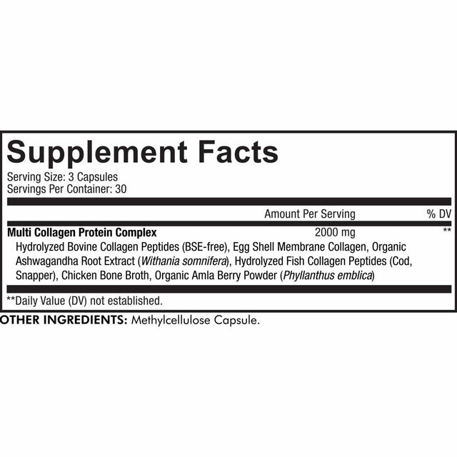 Hydrolyzed Bovine Collagen Peptides, Eggshell Membrane Collagen, Organic Ashwagandha Extract (root and leaf), Hydrolyzed Fish Collagen Peptides, Chicken Bone Broth Collagen Concentrate, Organic Amal Berry Extract. Other: methylcellulose capsule/div>