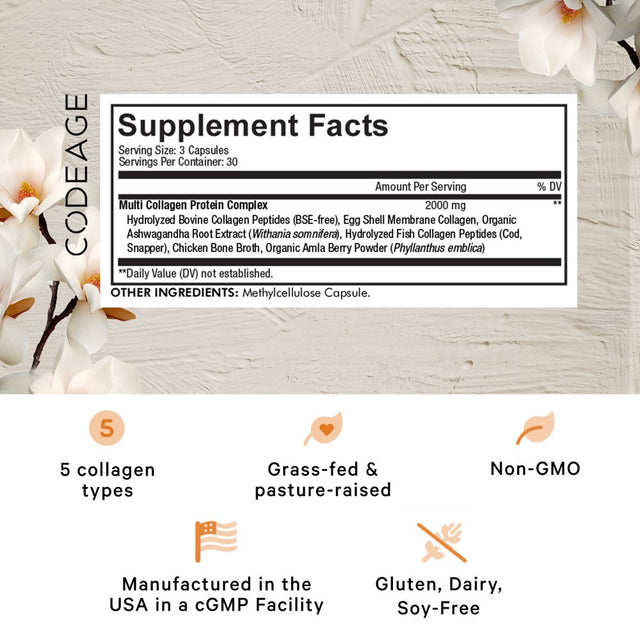 • ALL-IN-ONE HYDROLYZED COLLAGEN PEPTIDES WITH BONE BROTH: Codeage Multi Collagen capsules a high-quality blend of grass-fed bovine collagen, chicken, wild-caught fish and eggshell collagens.