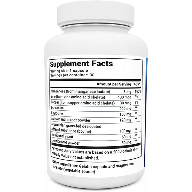 L-Theanine, L-Tyrosine, Ashwagandha, Organic Grass Fed Desiccated Adrenal Substance, Nutritional Yeast, Licorice Root, Manganese Lactate, Zinc Amino Acid Chelate, Copper Amino Acid Chelate, Gelatin capsule and magnesium stearate (vegetable source)/div>