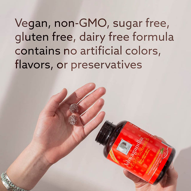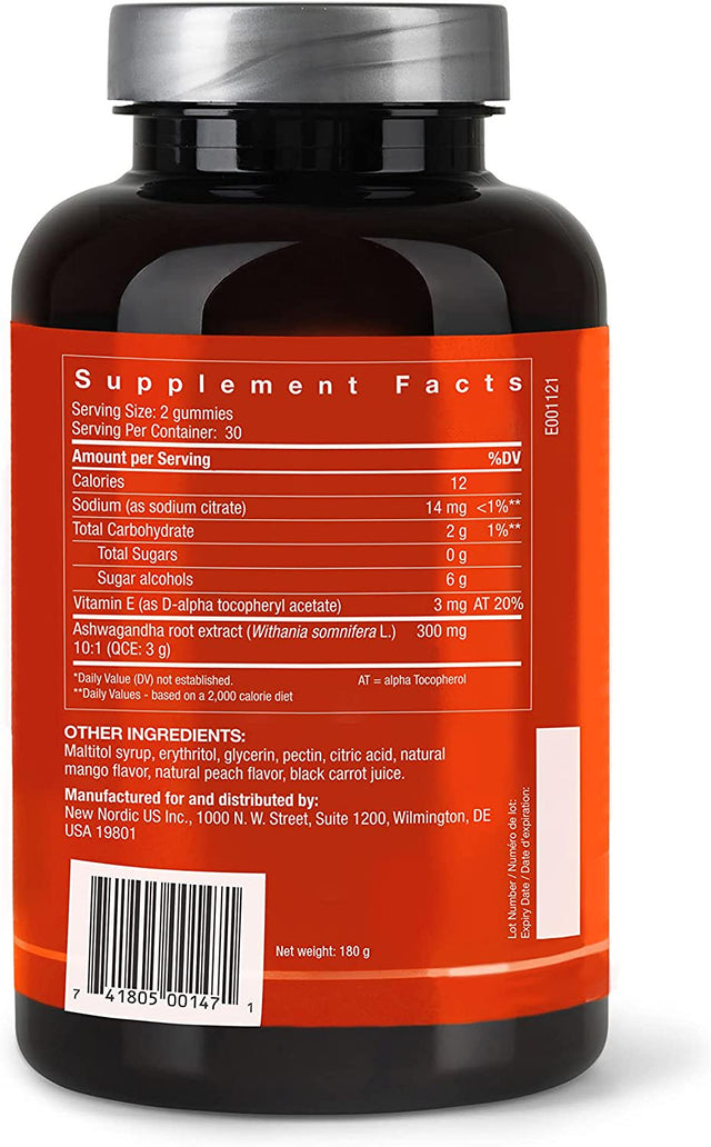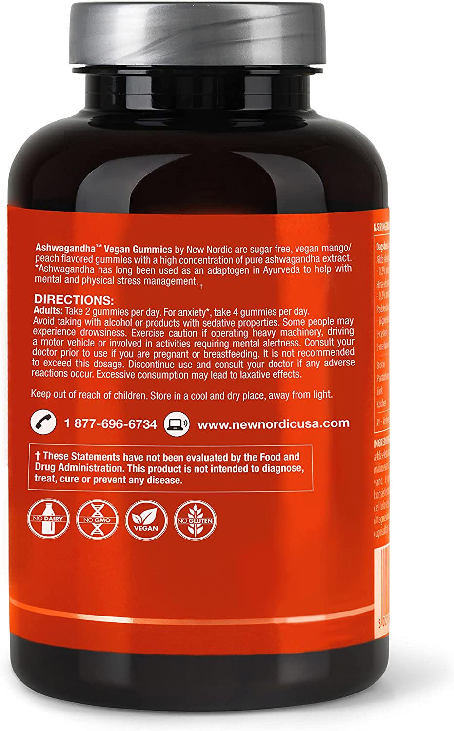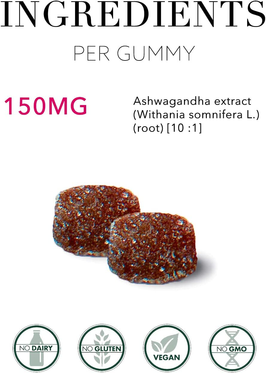 [ASHWAGANDHA GUMMIES] Adults 18+ take 2 gummies per day (150 mg per gummy) to increase energy and resistance to stress,[BENEFITS] Powerful adaptogen and antioxidants for managing daily mental stress, helps support normal hormone balance and manage physical stress post workout or surgery,[NATURALLY SOURCED] Ashwagandha extract also known as withania somnifera or winter cherry,[PURE INGREDIENTS] Vegan, non-GMO, sugar free, gluten free, dairy free formula contains no artificial colors, flavors, or preservatives,[SCANDINAVIAN MADE] Taking the best of traditional medicine and biological science, we source high quality, pure ingredients to create supplements that work with your body's natural systems for healthier, more sustainable results