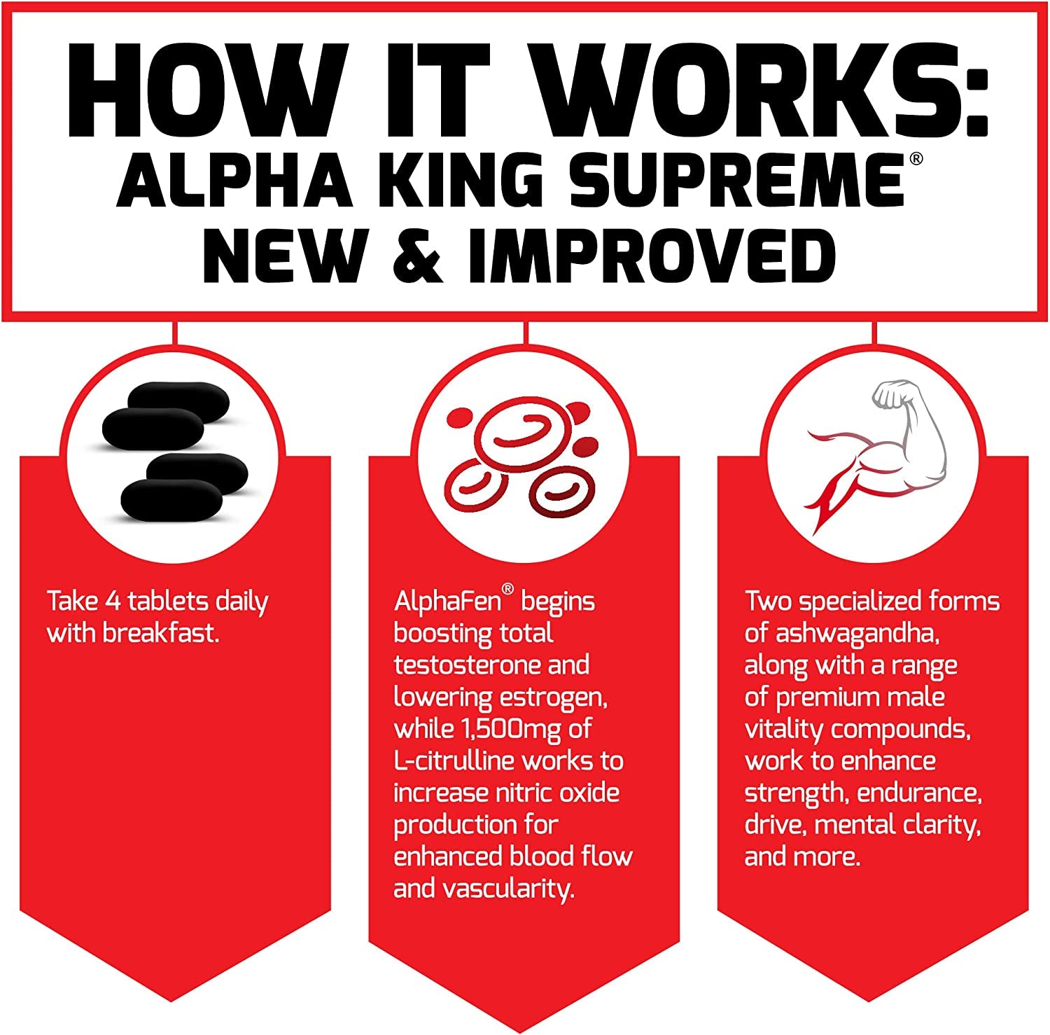 - Boost total testosterone: Alpha King Supreme new & Improved includes 500mg of AlphaFen, a powerful Fenugreek extract which helps boost total testosterone, decrease estrogen, bolster strength, and improve mood for comprehensive male hormone support.