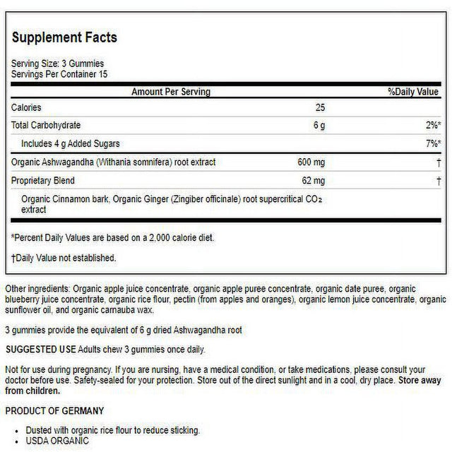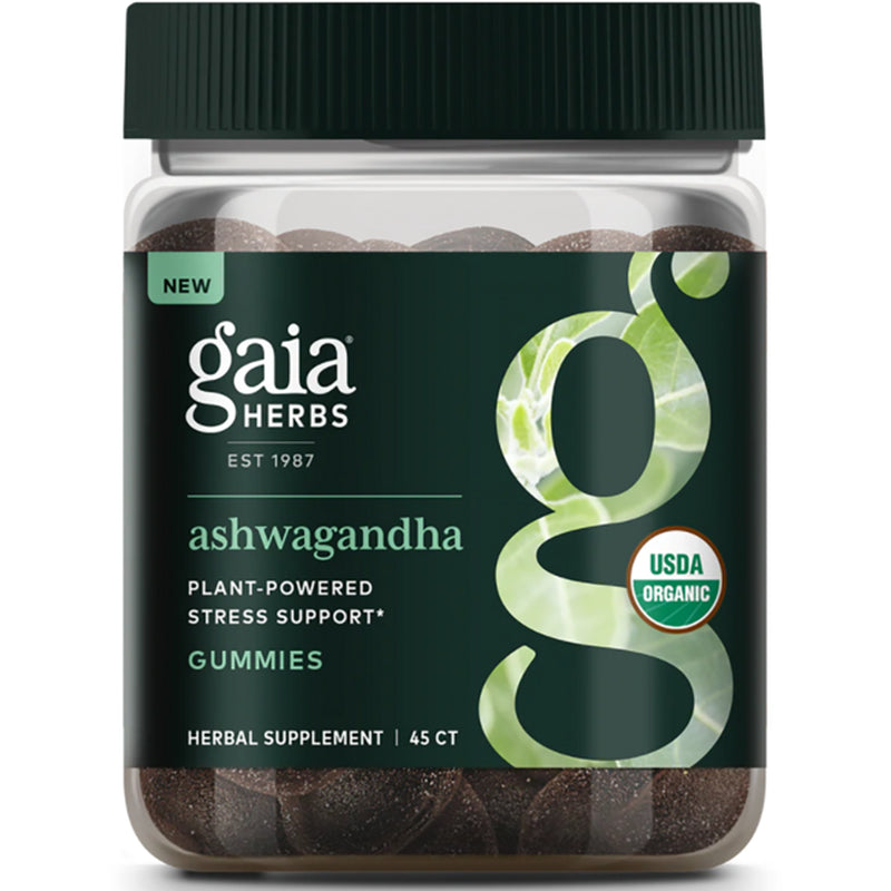 - Gaia Herbs Organic Ashwagandha Gummies, Supports Relaxation, with Cinnamon Bark, Apple Juice Concentrate, Ginger Root, and Date Puree, 45 Gummies (15 Servings)