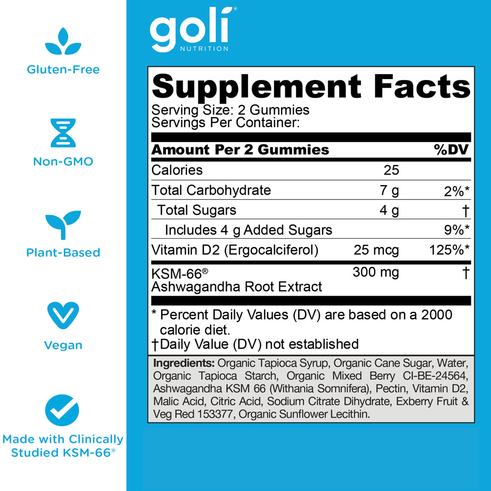 • Complementary Ingredients: Along with KSM-66 Ashwagandha, our formulation team has included Vitamin D for healthy immune system support.* Goli Ashwa Gummies are flavored with a delicious mixed berry profile. Satisfy your taste buds while you Relax, Restore and Unwind* with Goli Ashwa Gummies!