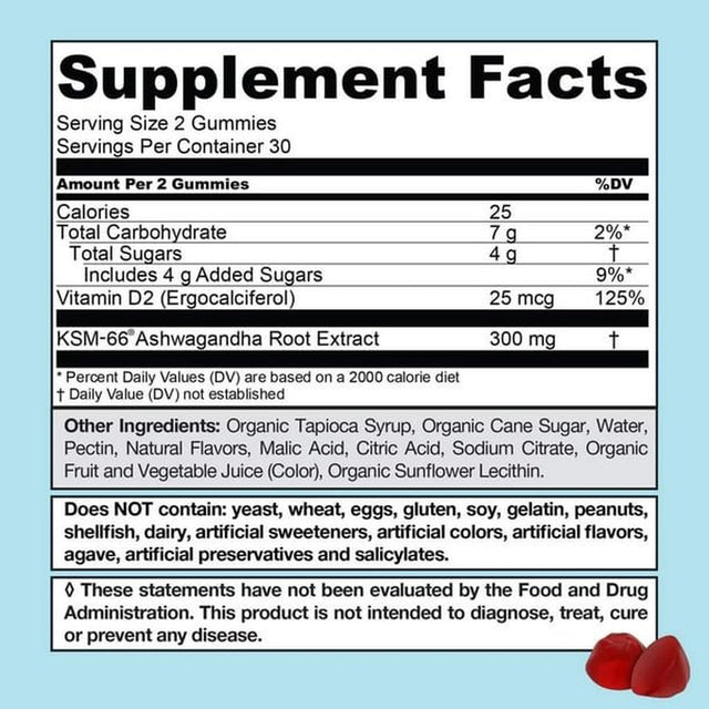 KSM-66® Ashwagandha Root Extract, Vitamin D2 (Ergocalciferol), Organic Tapioca Syrup, Organic Cane Sugar, Water, Pectin, Natural Flavors, Malic Acid, Citric Acid, Sodium Citrate, Organic Fruit and Vegetable Juice (Color), Organic Sunflower Lecithin./div>