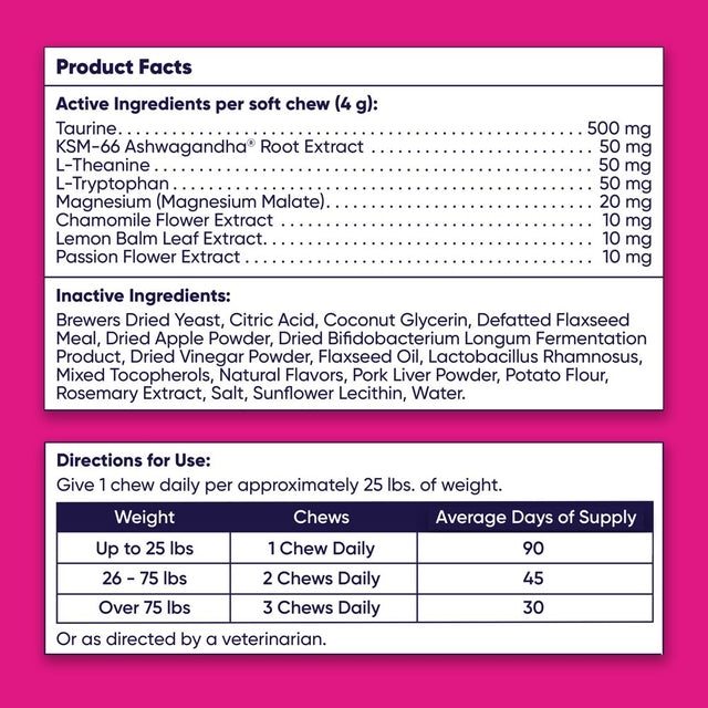 - Veterinarian formulated with the ‘goodest’ ingredients including Ashwagandha, Chamomile and L-Theanine