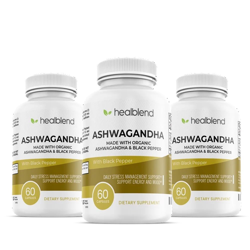 Healblend Organic Ashwagandha Supplement 1300Mg with Black Pepper Extract - Supports Stress Relief, Immune, Energy, Stamina & Mood, 100% Pure - 3-Pack