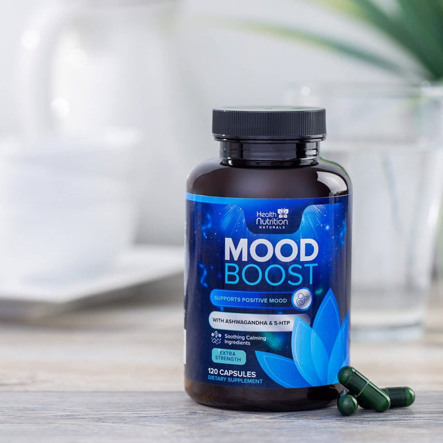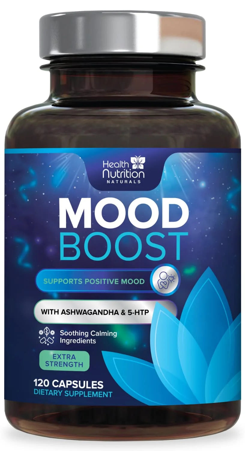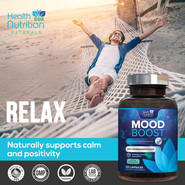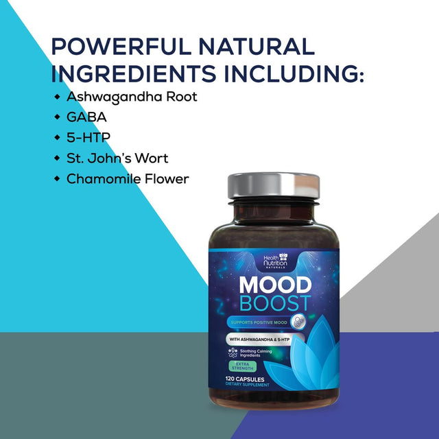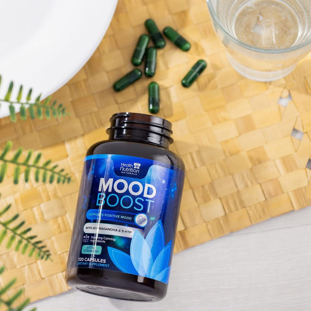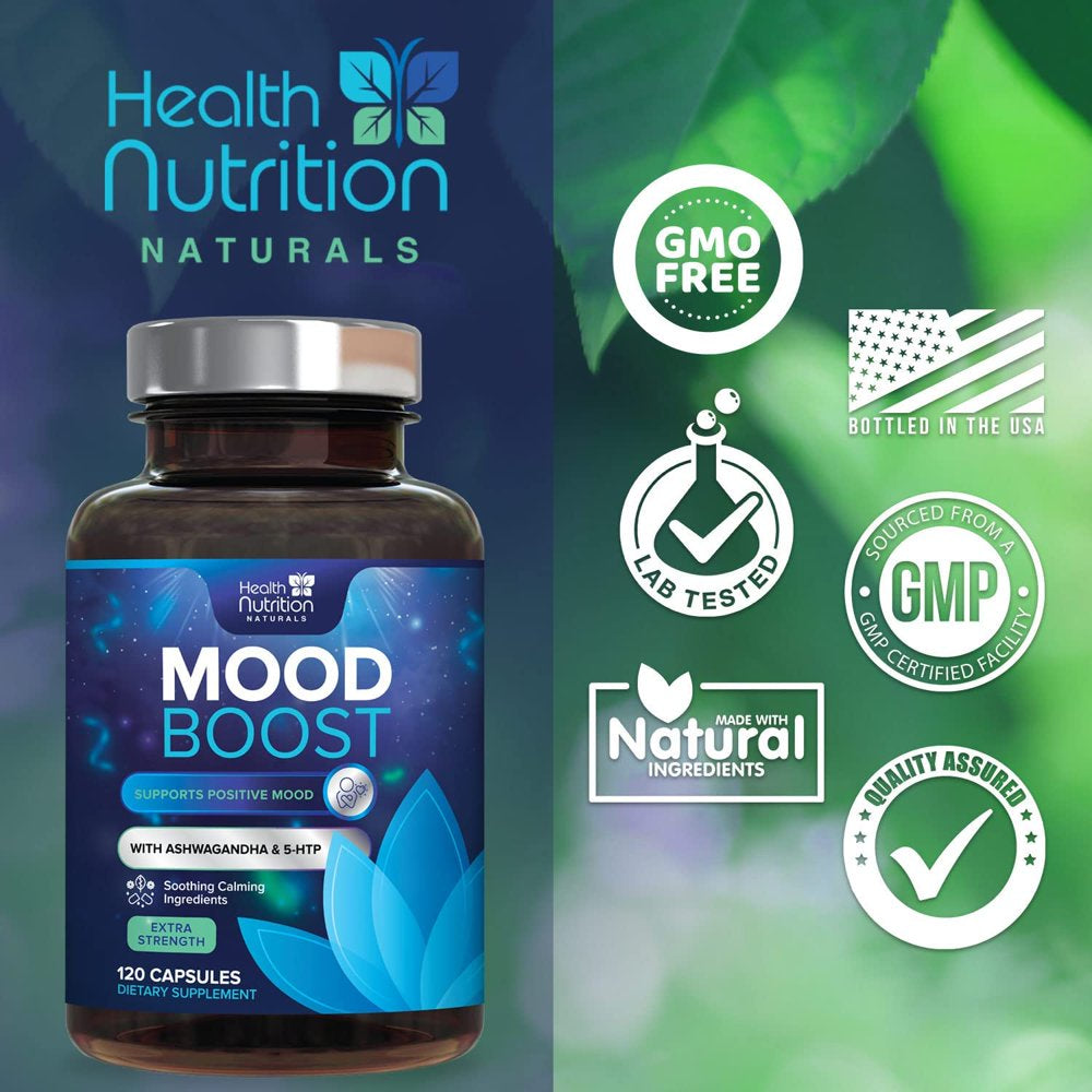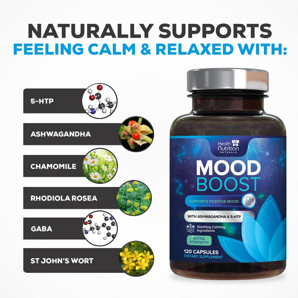 Health Nutrition Naturals Mood Boost Support for Stress 1100Mg - Mood, Calm, and Focus Supplement Formula with 5-Htp, Ashwagandha, GABA Non-Gmo, Vegan, & Bottled in USA Men Women 120 Capsules