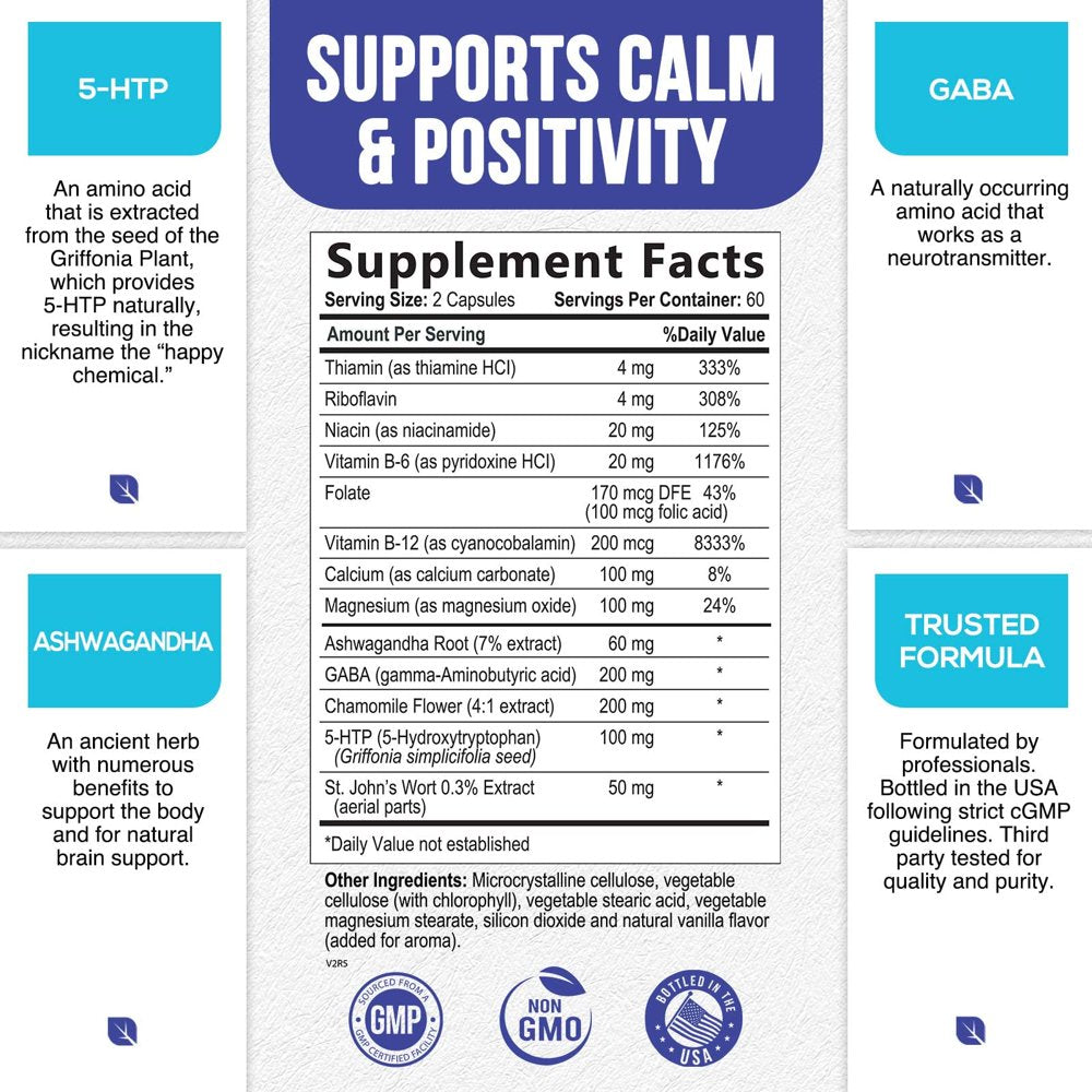 - Herbal Blend: Soothing herbal ingredients like Ashwagandha, St John's Wort, & Chamomile combined with vitamins and GABA provide long lasting mood support