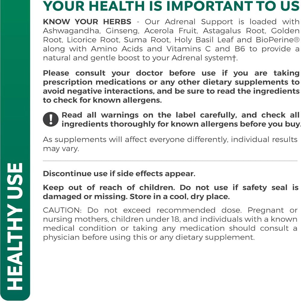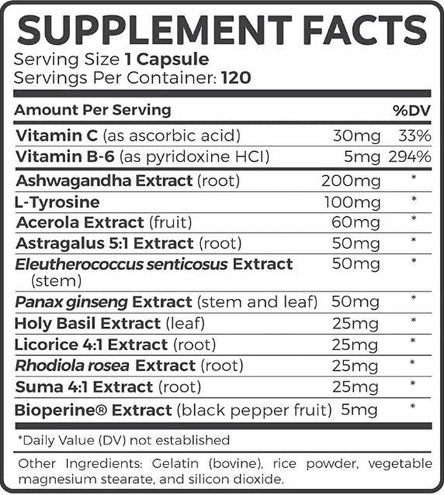 Keep your stress in check: Too much cortisol flowing through your body can lead to decreased cognitive performance, imbalances, and more. Too little can bring brain fog and unease. Strike the right balance by maintaining already healthy cortisol levels with our adrenal support supplement. We recommend one capsule daily, also pairs well with Thyroid Support.,Maintain cortisol balance: From basics like vitamins c and b6 to eleutherococcus senticosus, we ve carefully selected each ingredient in this adrenal support supplement for its ability to help regulate occasional stress and ensure your adrenal gland functioning in top form.,Dial down: occasional stress is part of life, but it need not dampen mind or body. That s why we include the best ingredients such as l-tyrosine, ginseng, rhodiola root, suma root, holy basil leaf and more in our adrenal support supplement. These work in concert to promote calm and help your body adapt to varying levels of stress.,Manufactured to rigorous standards: We elect to manufacture at a GMP certified facility, right here in the USA, using globally sourced ingredients. This means you can be confident that each capsule of our cortisol supplement will contain only natural, high-quality manger ingredients with no fillers or junk substitutes.,Order today: Experience the difference that maintaining well regulated cortisol levels can make to your day. Click add to cart today!