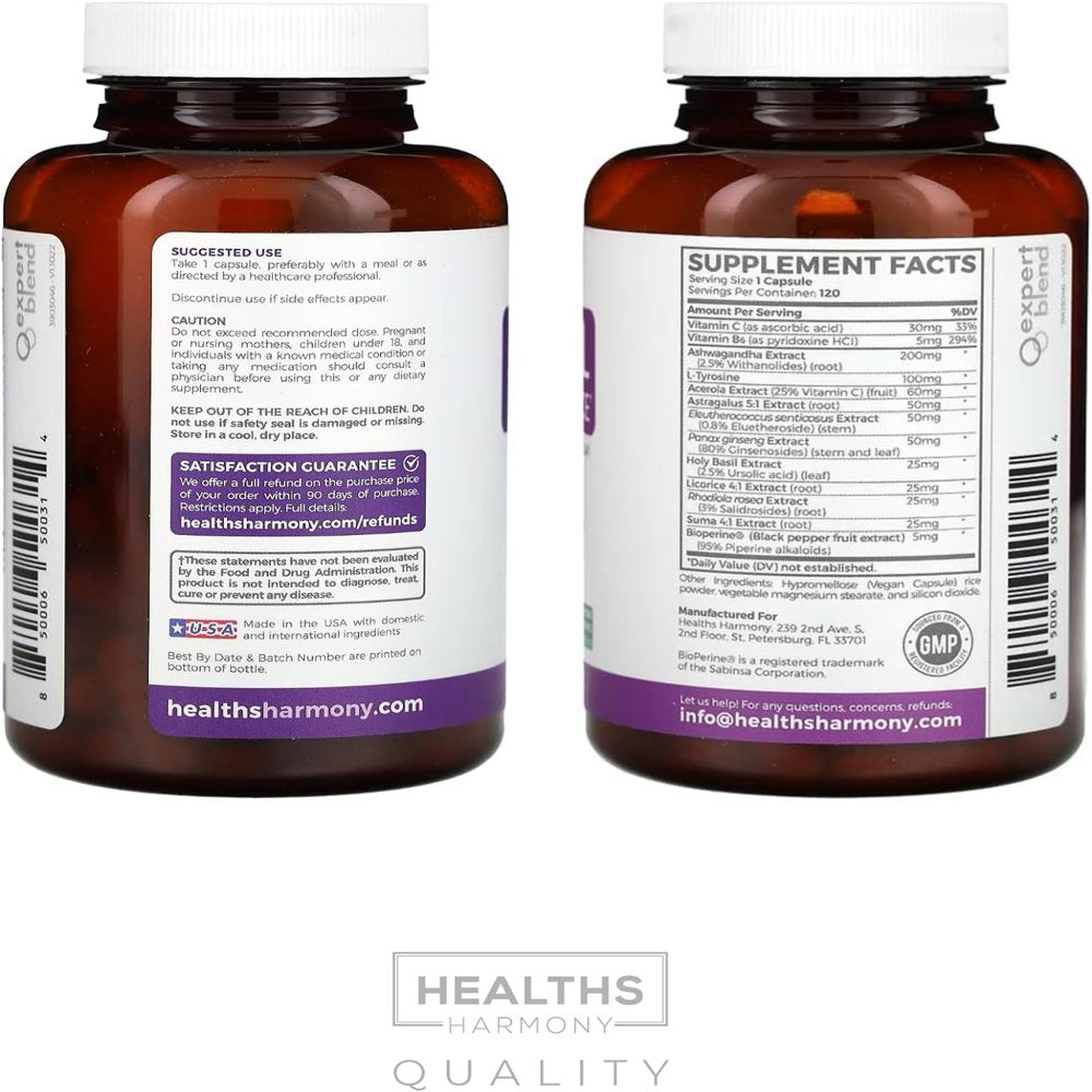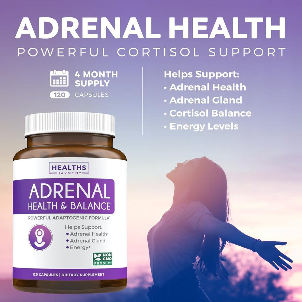 Healths Harmony Adrenal Support & Cortisol Manager (Non-Gmo) Adrenal Health with L-Tyrosine & Ashwagandha - Maintain Balanced Cortisol Levels & Stress Relief - Fatigue Supplement - 120 Capsules