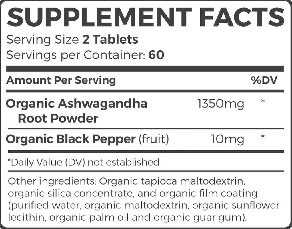 Organic Ashwagandha Root Powder 1350 mg, Organic Black Pepper (fruit) 10 mg. Other ingredients: Organic tapioca maltodextrin, organic silica concentrate, and organic film coating (purified water, organic maltodextrin, organic sunflower lecithin, organic palm oil, and organic guar gum)./div>