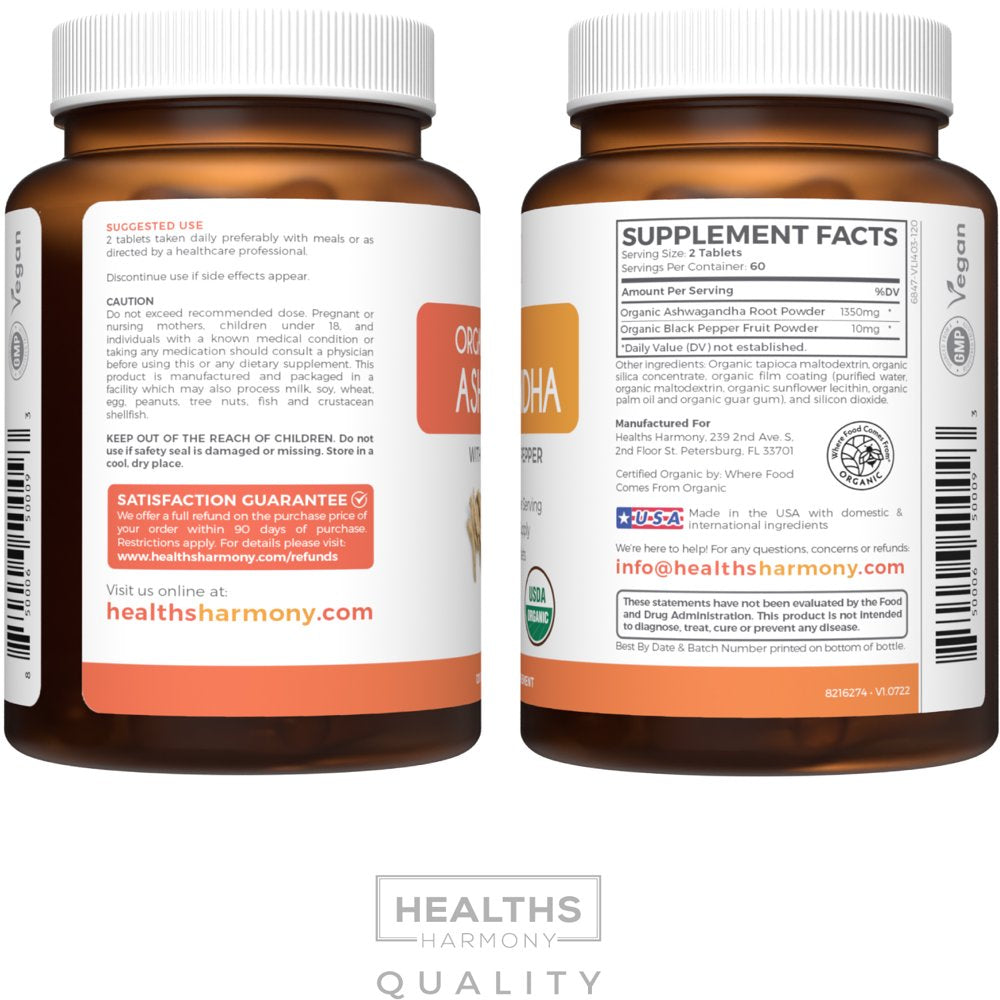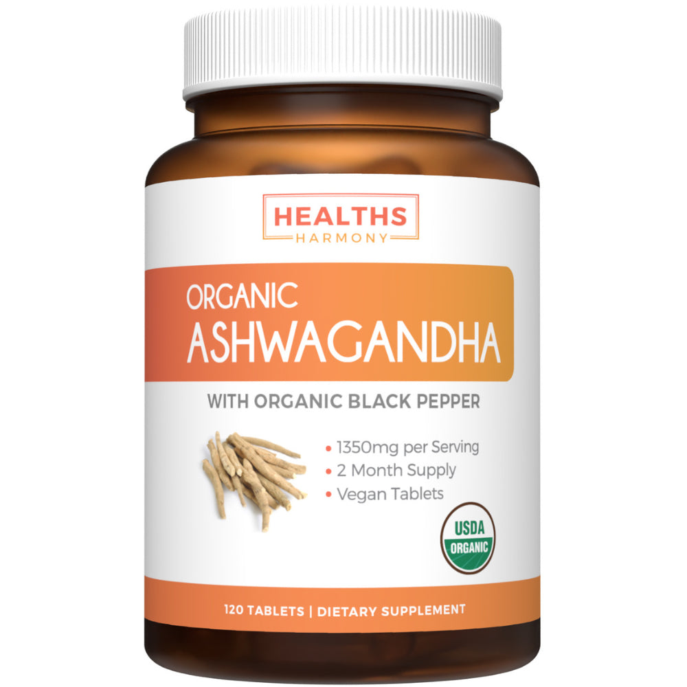Product Name Healths Harmony Organic Ashwagandha (120 Vegetarian Tablets) 1350mg per Serve - Natural Anxiety Relief, Immune, Adrenal, Cortisol & Thyroid Support - No Pills or Capsules