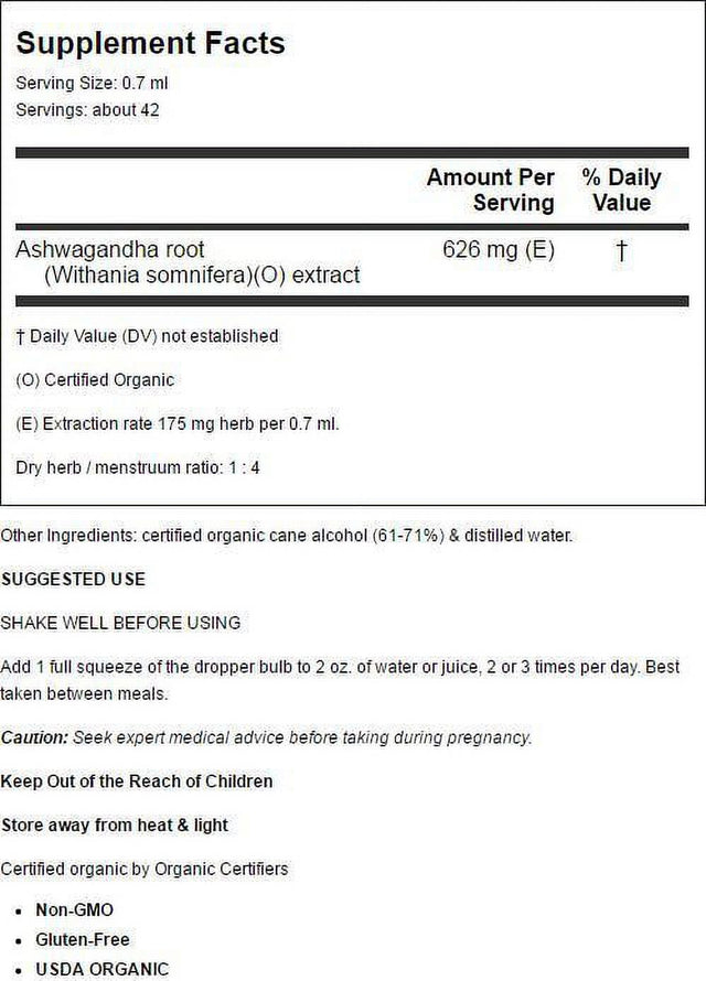 Ashwagandha root 626 mg (E),Other Ingredients: certified organic cane alcohol (61-71%) & distilled water.,SHAKE WELL BEFORE USING,Add 1 full squeeze of the dropper bulb to 2 oz. of water or juice, 2 or 3 times per day. Best taken between meals.,Certified organic by Organic Certifiers/div>