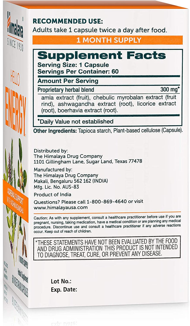 Himalaya Hello Energy Herbal Supplement with Ashwagandha, Amla, Haritaki, Daily Energy Support, Positivity, Metabolism, Caffeine Free, Gluten Free, Non-Gmo, Vegan, 60 Capsules, 30 Day Supply