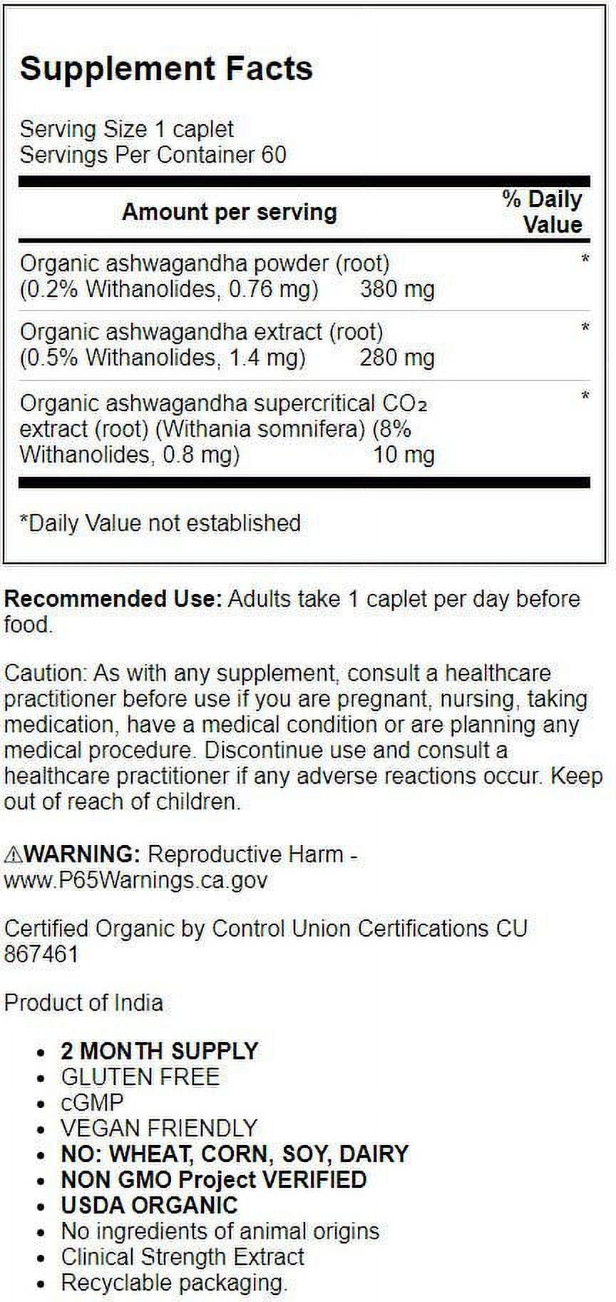 Organic Ashwagandha powder (root) 380 mg* (0.2% Withanolides, 0.76 mg) Organic Ashwagandha extract (root) 280 mg* (0.5% Withanolides, 1.4 mg) Organic Ashwagandha supercritical 10 mg* CO2 extract (root) (Withania somnifera) (8% Withanolides, 0.8 mg) *Daily Value Not Established/div>
