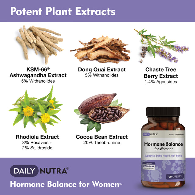 Hormonal Balance for Women is a blend of natural, plant-based extracts that work in harmony to balance hormonal levels in women of all ages, as well as to act as a natural mood booster. This soothing blend includes the powerful adaptogen KSM-66 Ashwagandha -- clinically demonstrated to increase resistance to stress and promote relaxation -- as well as Dong Quai, Chaste Tree Berry, Rhodiola, and Cocoa Bean -- plant extracts traditionally used to reduce irritability, sleep disturbances, mood conditions, and cramping.