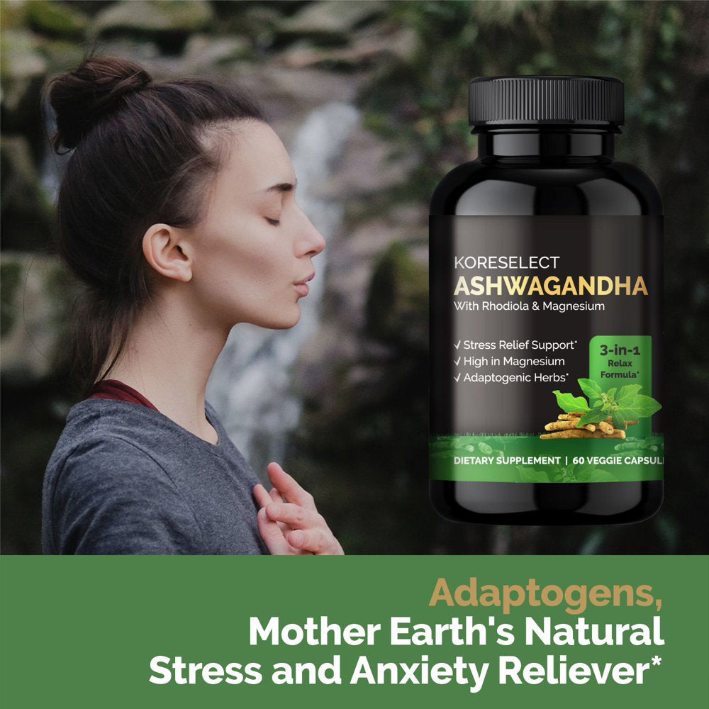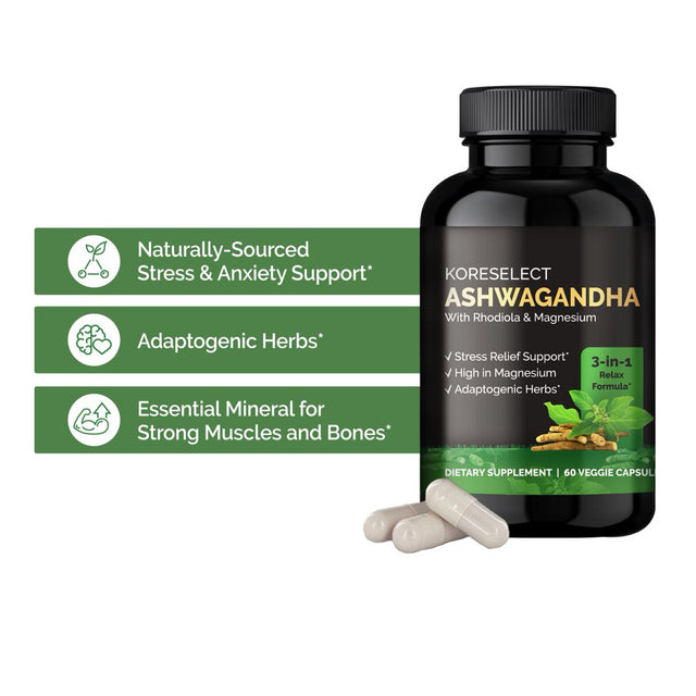 Product Name KORESELECT Ashwagandha Capsules with Magnesium & Rhodiola Rosea - 5% Withanolides, Natural Mood Relief, Adaptogens Supplement, Boost Energy & Focus - Vegan 60 Caps