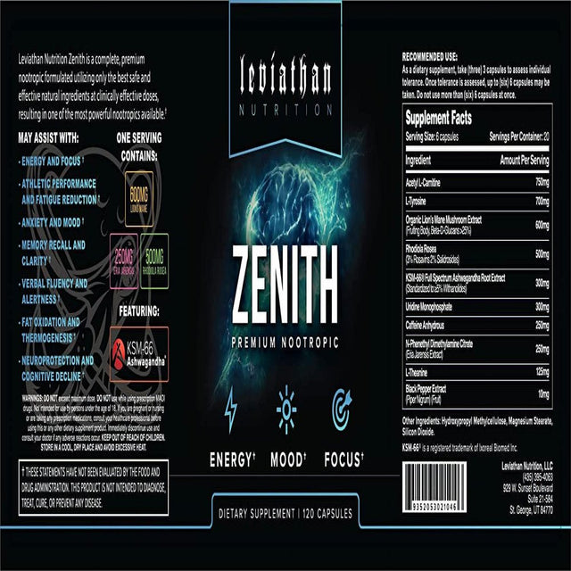 Leviathan Zenith Premium Nootropic Brain Supplement for Concentration, Brain Support for Energy, Memory and Focus - Lions Mane Mushroom, Ashwagandha - 120 Capsules is backordered and will ship as soon as it is back in stock.