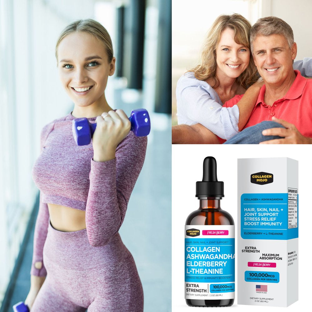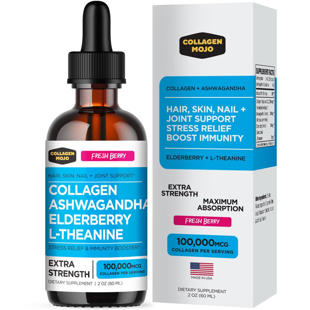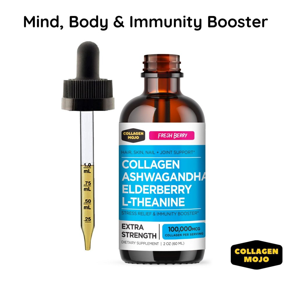 Liquid Collagen Peptides with Ashwagandha, Elderberry & L-Theanine. High Potency and Absorption Formula. Hair, Skin, Nail + Joint Support. Stress Relief & Immunity Booster – Collagen Mojo - 2 Oz.