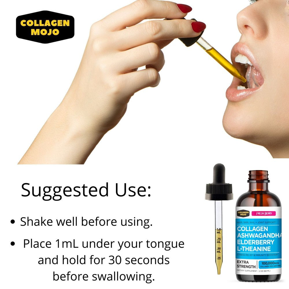 Premium Ingredients - Liquid Collagen Peptides with Ashwagandha, Elderberry and L-Theanine. 100,000mcg collagen per serving. Just one dropper under your tongue. Fresh Berry flavor. Color may vary. For women and men. Convenient, delicious and easy.