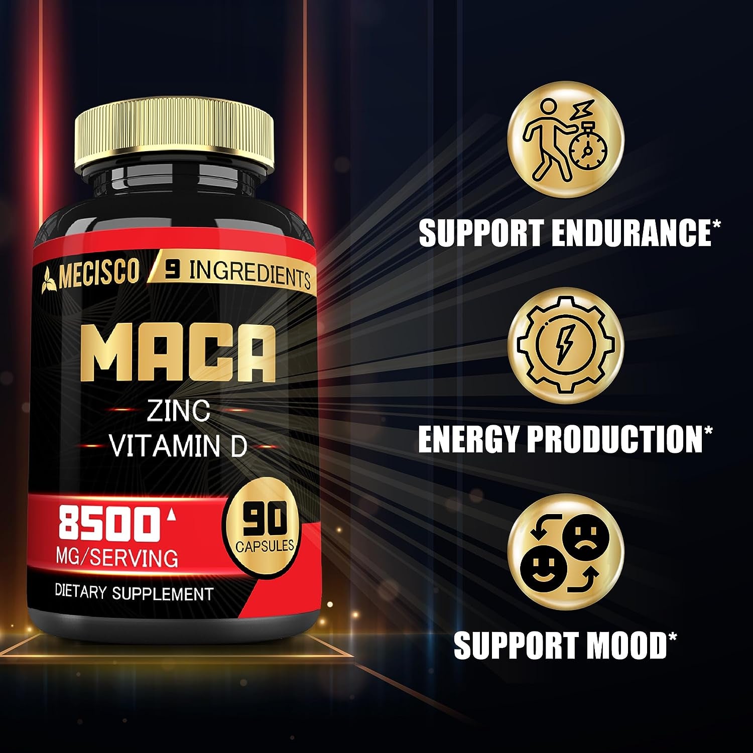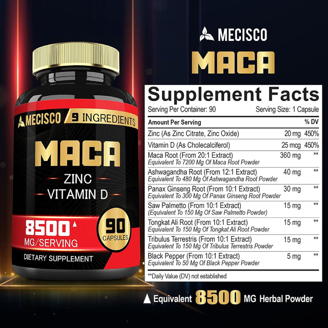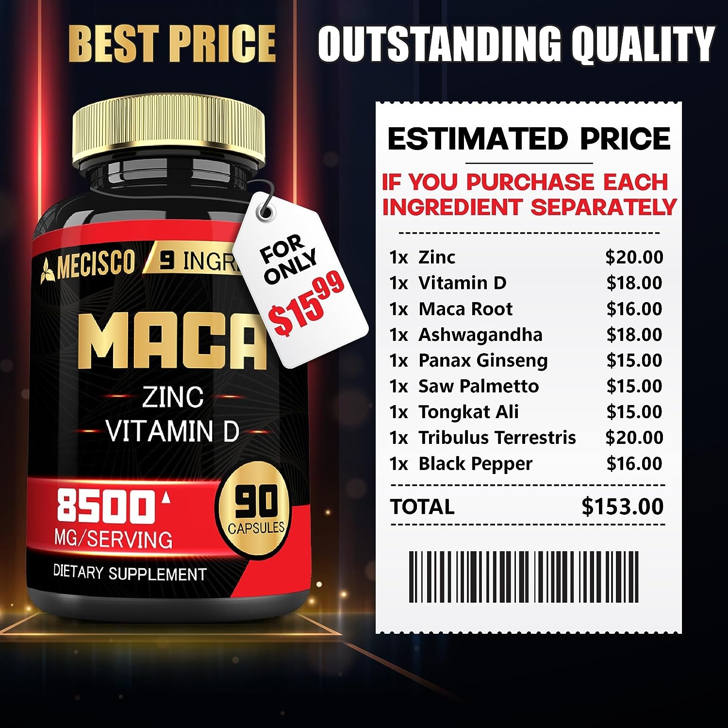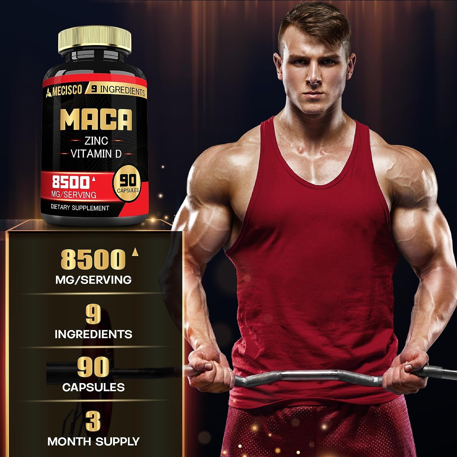 Maca Capsules - 9In1 Equivalent 8500Mg Blended with Zn, Vitamind, Ashwagandha, Ginseng, Saw Palmetto, Tongkat Ali & More - Muscle Growth, Endurance & Energy Support - 90 Count - 3 Month Supply