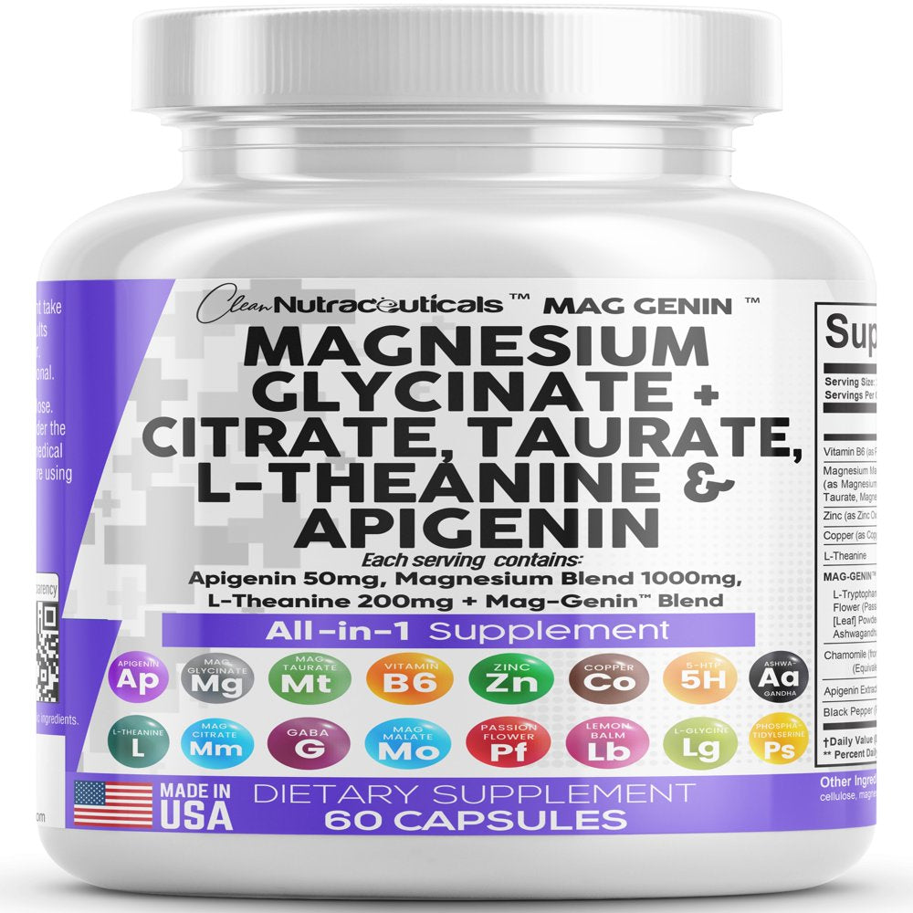- The Ultimate Magnesium Supplements You've Been Looking For - Clean Nutra's Mag Genin provides 5 full dose products in one, containing a full Magnesium Taurate and Glycinate, Magnesium Citrate Capsules, Theanine 200mg Capsules, and Apigenin. Stronger than most pure magnesium glycinate capsules, magnesium citrate liquid, l theanine 100 mg and magnesium glycinate liquid. This revolutionary product that makes products like magnesium malate capsules and chelated magnesium glycinate old fashioned.