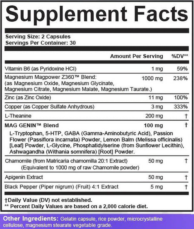 - Introducing the Mag Genin Blend - This powerful supplement also contains L-Tryptophan, 5 HTP, Passion Flower, L Glycine and more to make a packed magnesium for sleep and powerful magnesium supplement for women. This helps bolster the magnesium triple complex effects while producing a reliable mag glycinate with high absorption magnesium forms. These aren't your typical magnesium citrate 400mg, l theanine 400mg, magnesium glycinate 400, or magnesium glycinate gummies for adults.