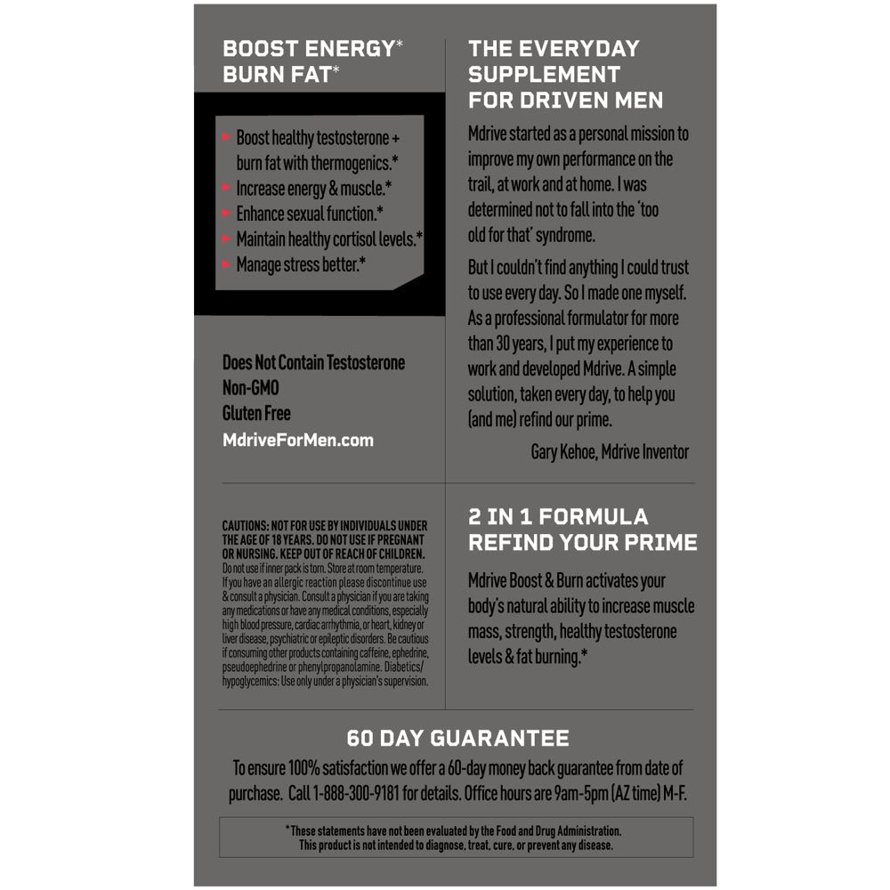 Mdrive Boost & Burn was specifically designed for guys determined to lose a few extra pounds. Powerful Clinically Tested Ingredients, 600mg KSM 66 Ashwagandha, 200mcg Chromium (from Chromax), 15mg Zinc (from L-Optizinc), 5mg Bioperine, 100mg Advantra Z per serving.