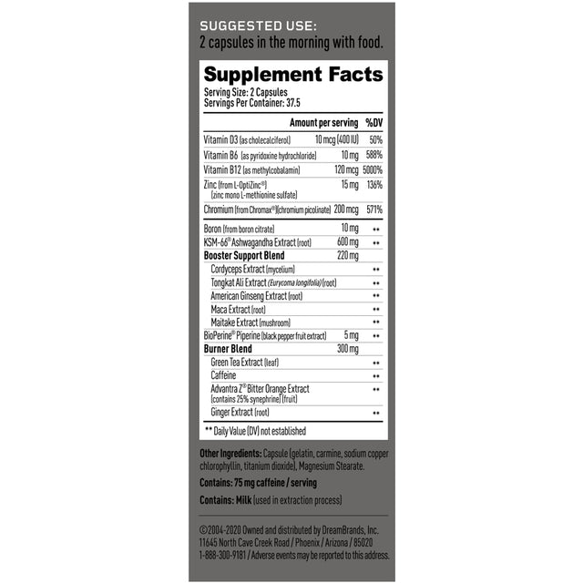 • Powerful Clinically Tested Ingredients, 600mg KSM-66 Ashwagandha, 200mcg Chromium (from Chromax), 15mg Zinc (from L-Optizinc), 5mg Bioperine, 100mg Advantra Z per serving