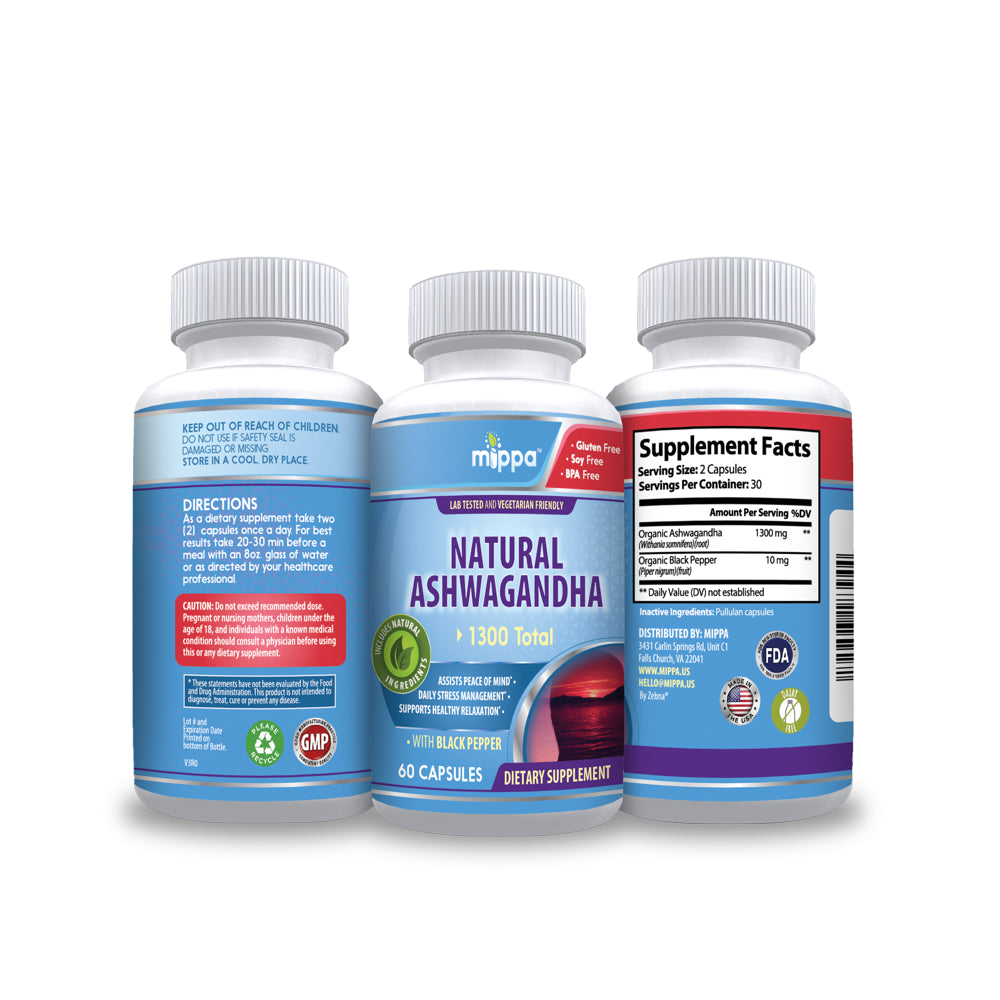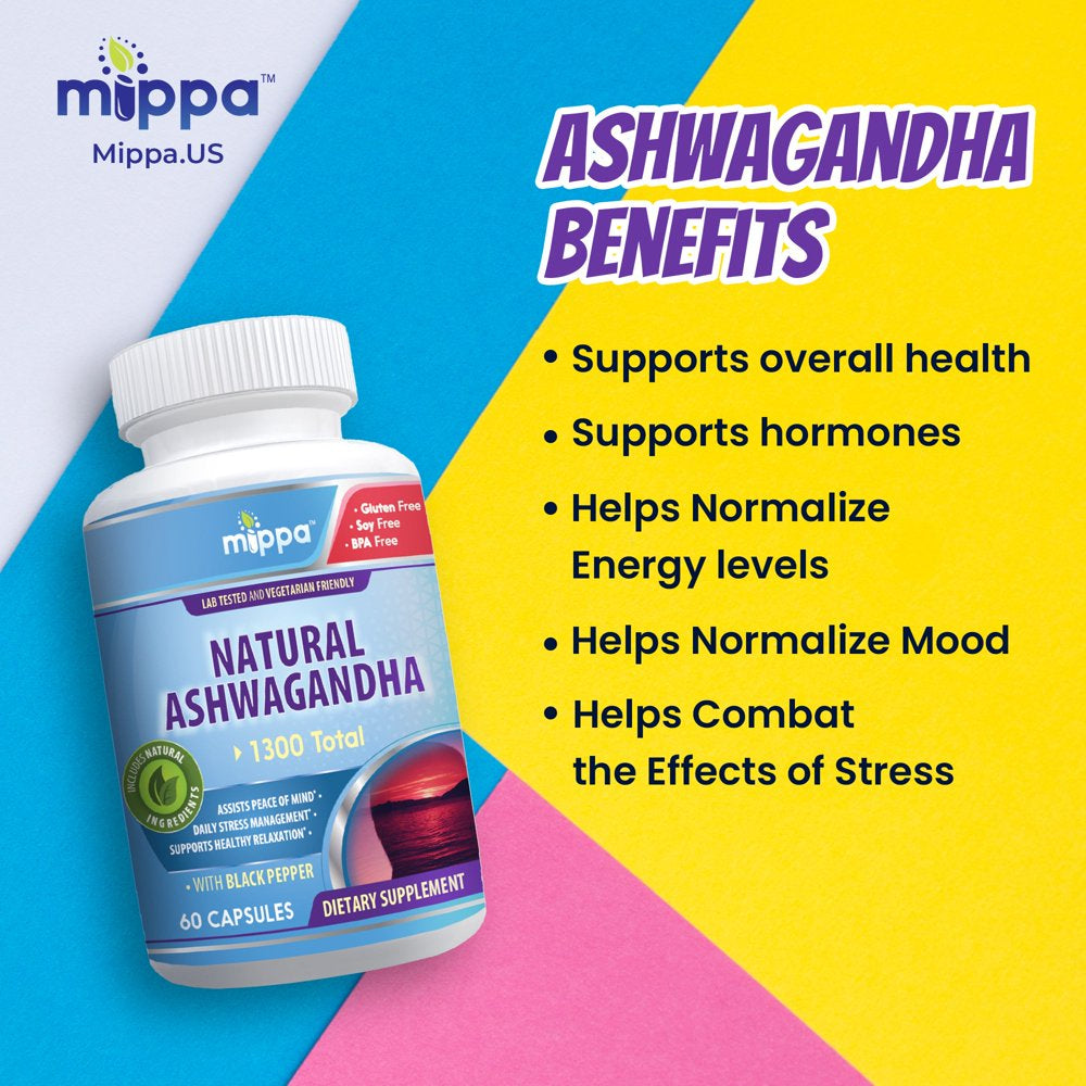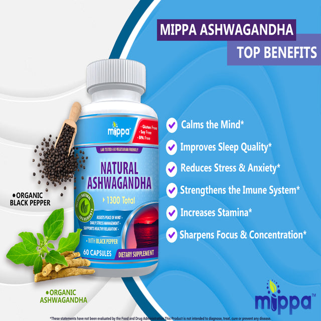 - Why to use: Mippa Ashwagandha Supplements: Our Ashwagandha with black pepper is made with natural vegan ingredients. It is free of chemicals like gluten, starch, glucose, and cholesterol. It is free from any hormone or preservative. Black pepper has many health benefits with Ashwagandha. It makes sure the absorption of all the nutrients that Ashwagandha offers. This formula is a pure natural combination of herbs packed inside a capsule that provides many health benefits.