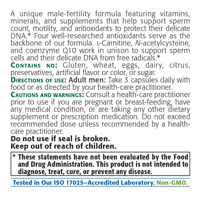 A unique male-fertility formula featuring vitamins, minerals, and supplements that help support sperm count, motility, and antioxidants to protect their delicate DNA.* Four well-researched antioxidants serve as the backbone of our formula. l Carnitine, N acetylcysteine, and coenzyme Q10 work in unison to support sperm cells and their delicate DNA from free radicals.* Contains no: Gluten, wheat, eggs, dairy, citrus, preservatives, artificial flavor or color, or sugar. Directions of use: Adult men: Take 3 capsules daily with food or as directed by your health-care practitioner. Cautions and warnings: Consult a health-care practitioner prior to use if you are pregnant or breast-feeding, have any medical condition, or are taking any other dietary supplement or prescription medication. Do not exceed recommended dose unless recommended by a healthcare practitioner.