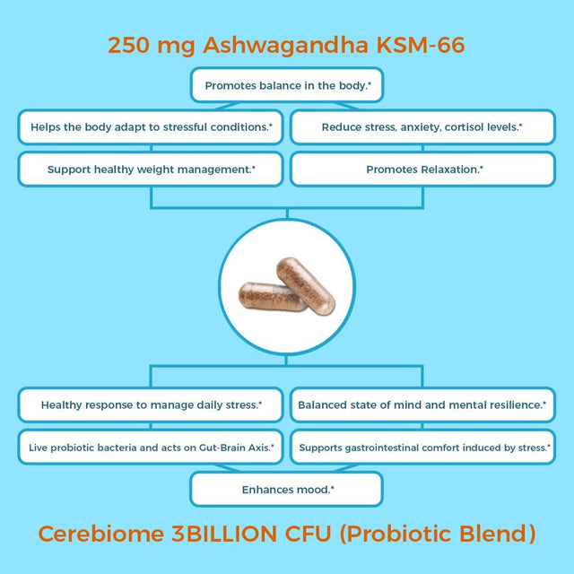 About this item STRESS RELIEF & MOOD BOOST - Promote a more balanced state of mind for better mental resilience. Made with high quality probiotic formulation combining 2 strains to offer natural support to help enhance mood, relax in times of occasional stress and improve sleep. Paired with KSM-66 Ashwagandha to offer healthy responses to manage daily stress, reduce cortisol levels.* HIGH QUALITY INGREDIENTS - Made with Cerebiome and Ashwagandha to support quality rest, optimal relaxation, and help relieve stress. Both ingredients work together to help enhance mood, support gastrointestinal comfort with live probiotic bacteria by acting on the Gut-Brain Axis to help manage stress-related food cravings, and respond to occasional stressors.* IS OPTIMAL STRESS RELIEF RIGHT FOR YOU? - Feeling day-to-day stress is a universal experience. Need help promoting your resilience to mental and physical fatigue related to stress?Whether you’re a student with a full course load, a new mother, an overworked employee, or just occasionally feeling overwhelmed, this product can help bring you the relief, relaxation, and mood boost you need!* SUPPORTS BRAIN-GUT AXIS - The gut and the brain communicate daily through 3 different pathways (neural, neuroendocrine, and immune). This bi-directional communication intensifies in times of stress and can lead to gut discomfort. Cerebiome supports brain functions by supporting healthy cortisol (stress hormone) levels. This helps regulate your gut in stressful situations.* TRUST - Our product is Non-GMO and does not require refrigeration and is shelf stable. Made with no gluten, wheat, egg, fish/shellfish, or peanuts/tree nuts. Optimal stress is a probiotic supplement that comes with 60 vegetable capsules. Combining Cerebiome 3 Billion CFU and 250mg Ashwagandha to support a calming mood, mental clarity, relaxation, and help relieve stress.*