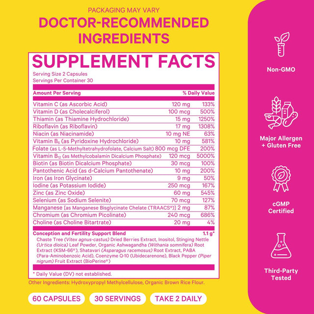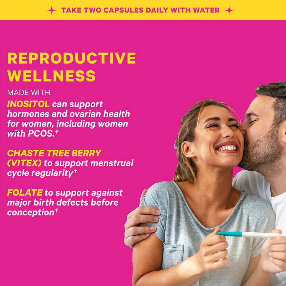 - Contains: Folate (the natural form of folic acid), Vitamin D, Biotin, Vitamin B12, Vitamin B6, Selenium, Chromium, Zinc, Vitex (Chaste Tree Berry), Vitamin B6, Myo-Inositol, Ashwagandha, and more.