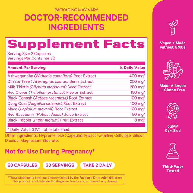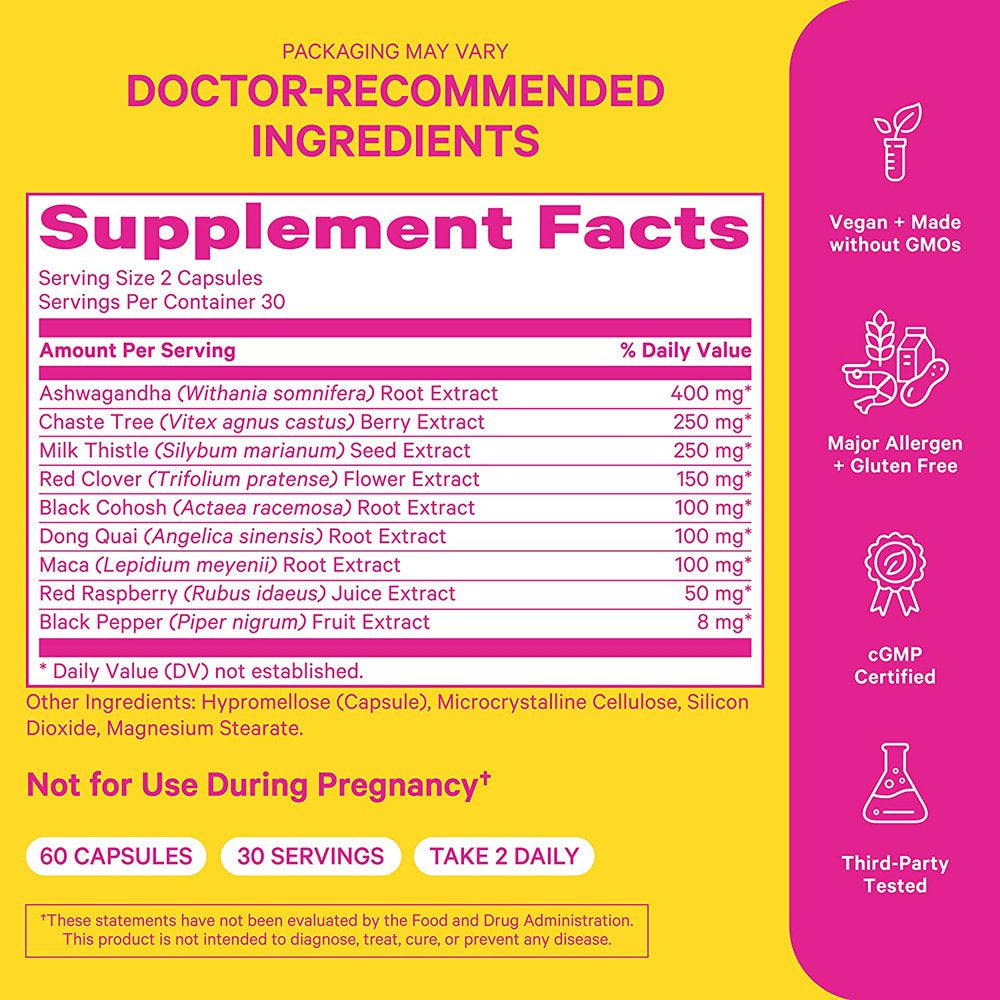 - Ashwagandha, Chaste Tree Berry (Vitex), Red Clover, Black Cohosh, Dong Quai, Maca Root, and more